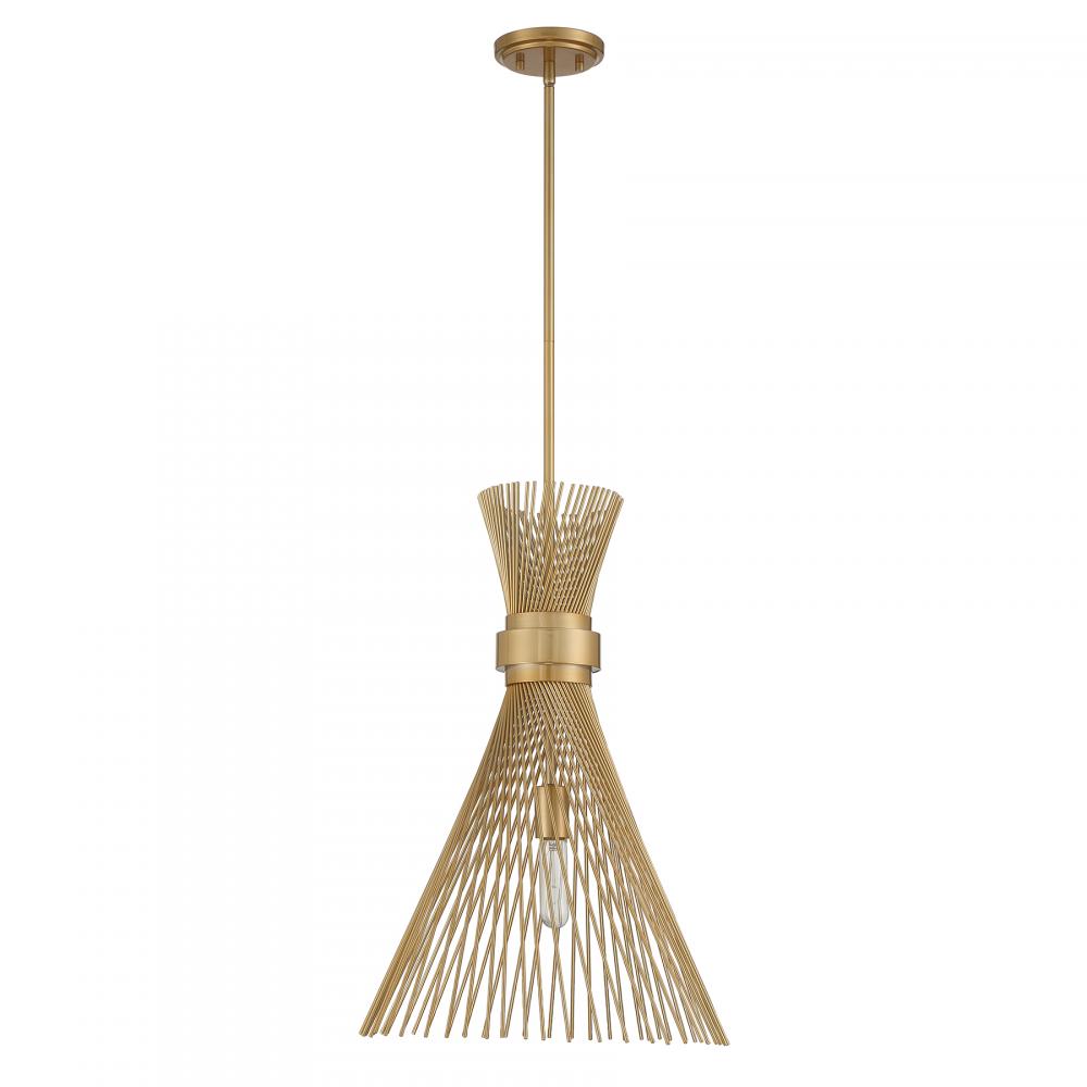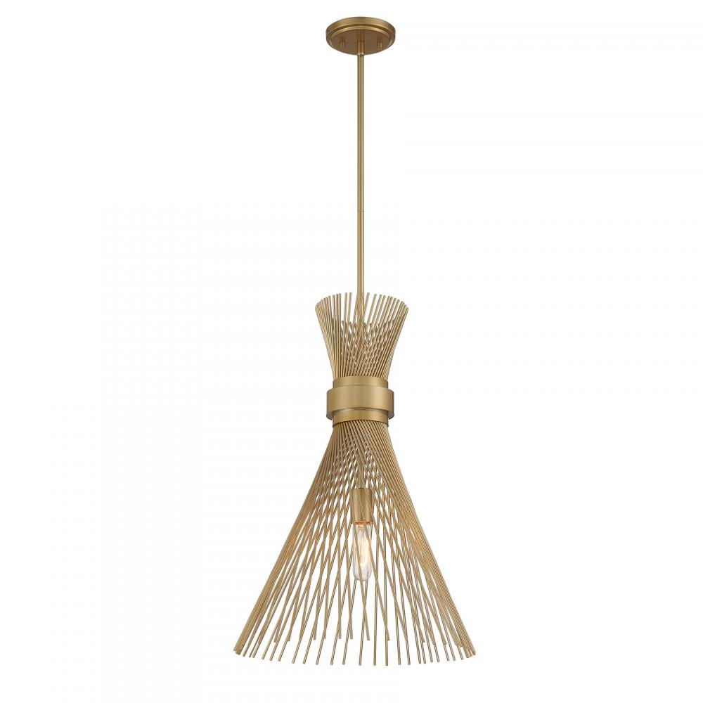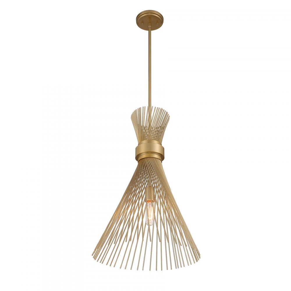 The Savoy House Longfellow 1-light pendant showcases a fashionable style with metal rods that are gathered together at the center and unfurl outward. When the light is on, it creates a dramatic glow that is sure to catch the eye. Burnished Brass finish. Longfellow is 16" in width and has an adjustable height ranging from 24" to 78". Comes with four 12" downrods and one 6" downrod. Uses one standard size bulb of up to 60 watts. The bulb is not included.