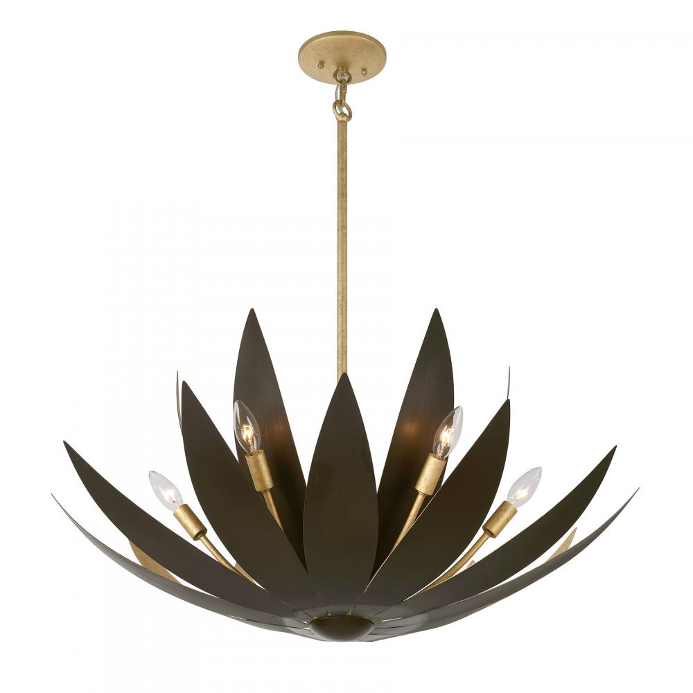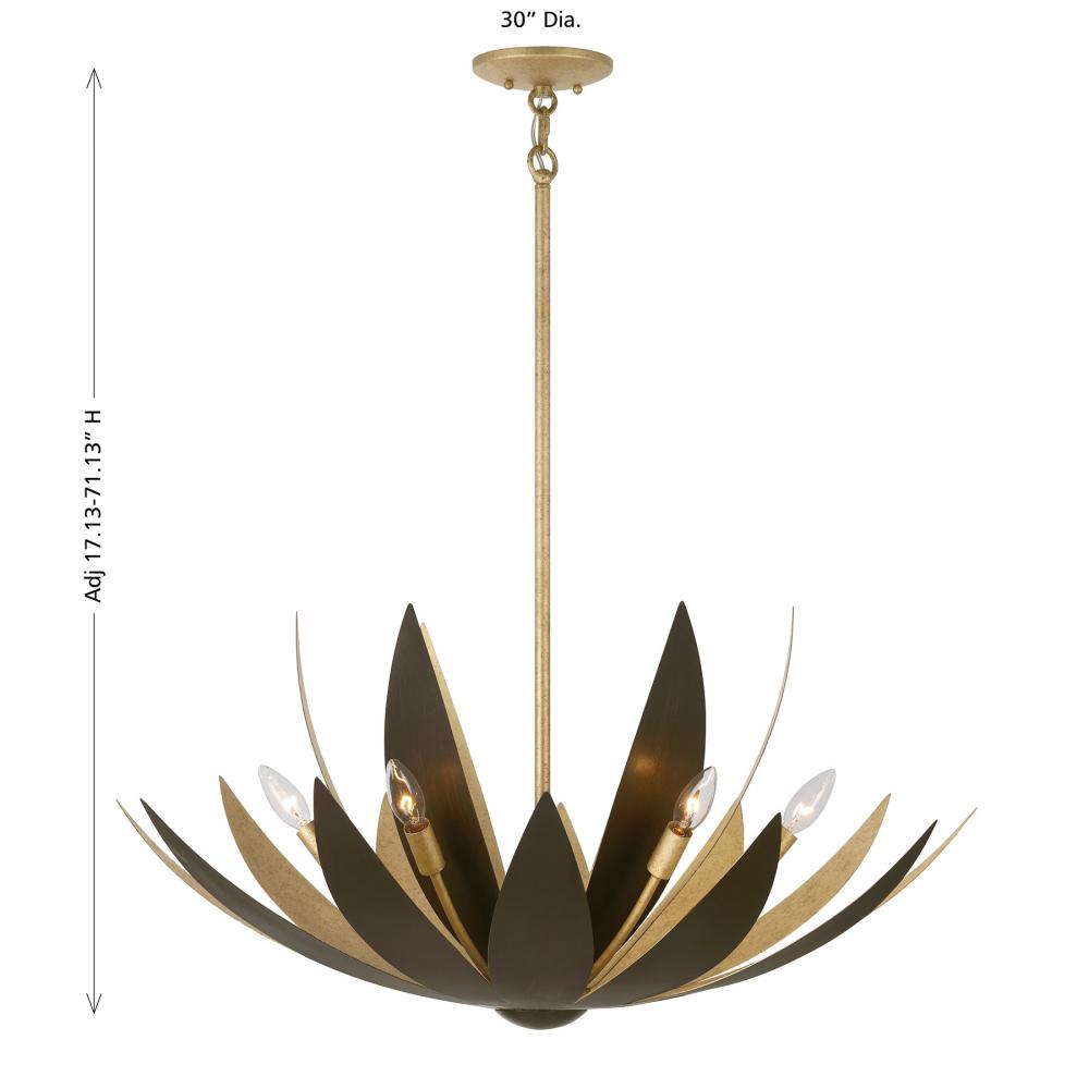 Bring in the beauty of nature with the Savoy House Loto 6-light pendant, which was designed by award-winning interior designer and TV host Breegan Jane. It is inspired by and named for the tranquil lotus flower, the iconic look represented here by softly unfurling petals finished in hand-applied Burnished Gold and Centura. Loto is 30" in width and has an adjustable height ranging from 17.13" to 71.13". It uses six candelabra size bulbs of up to 60 watts per bulb. Bulbs not included. Comes with four 12" downrods and one 6" downrod.