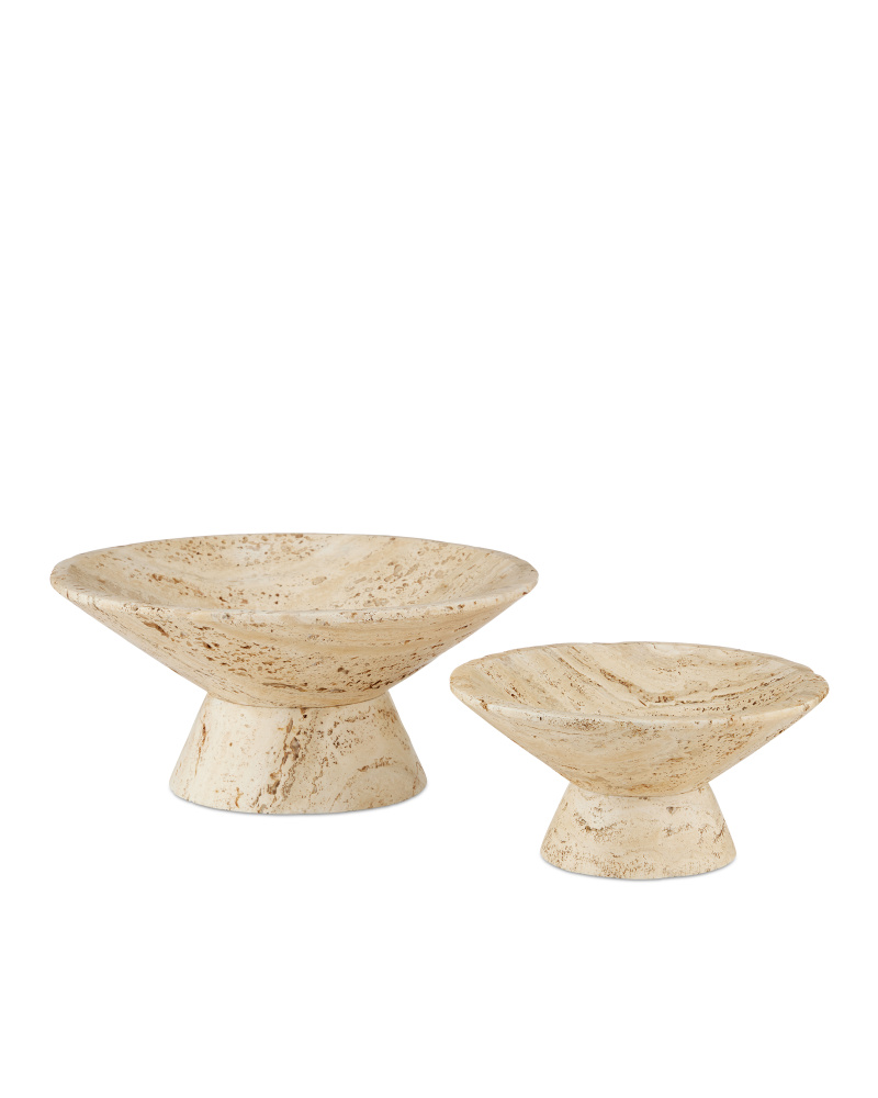 The Lubo Travertine Small Bowl is made of Travertine, which has a swirling personality as fluid as the shifting sands of the desert. The tan footed bowl will be a chameleon in an interior, as it will be just as fitting for holding decorative objects in a main living space as it will be for displaying brightly-colored ornaments during the holidays. The surfaces will vary from piece to piece.