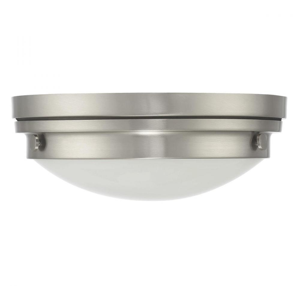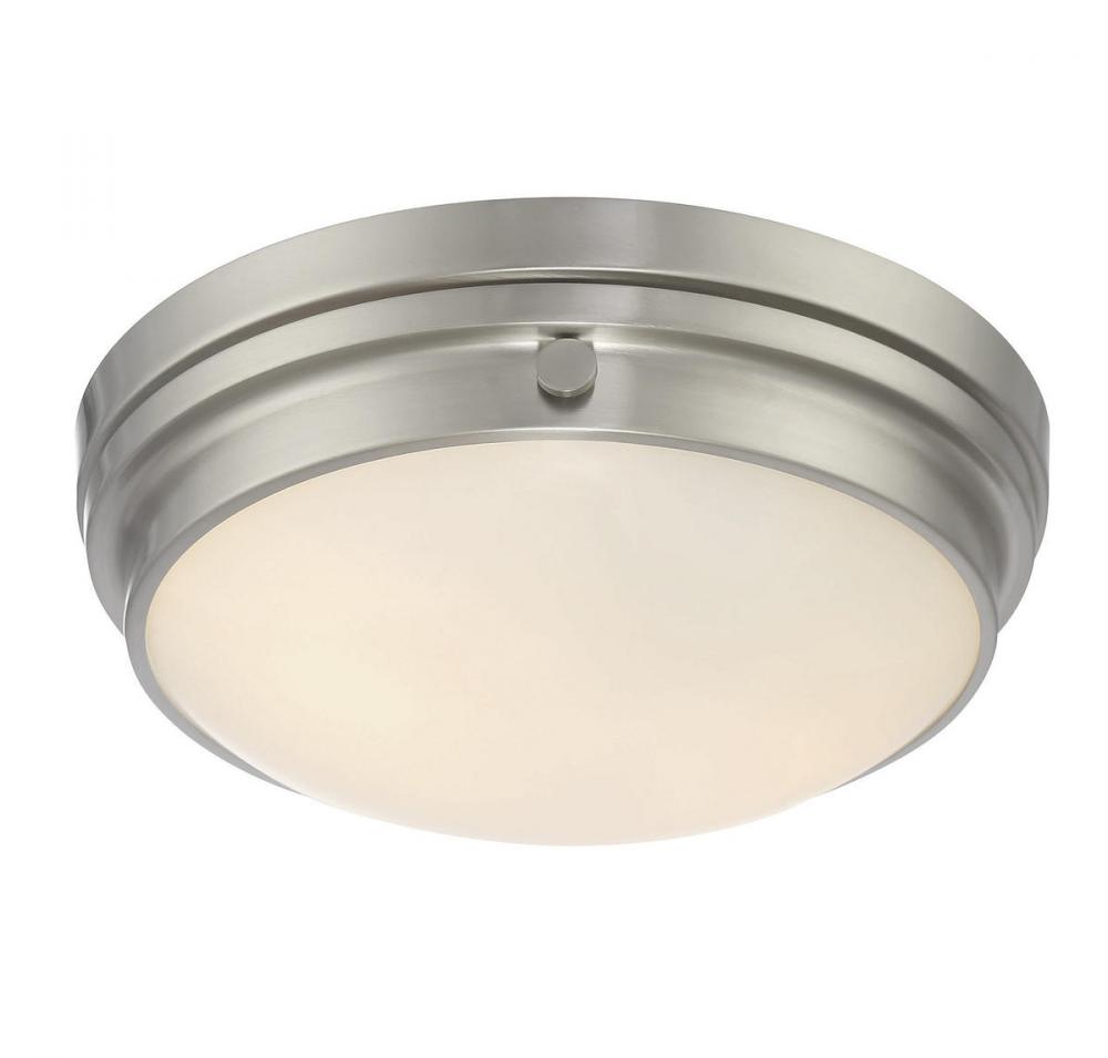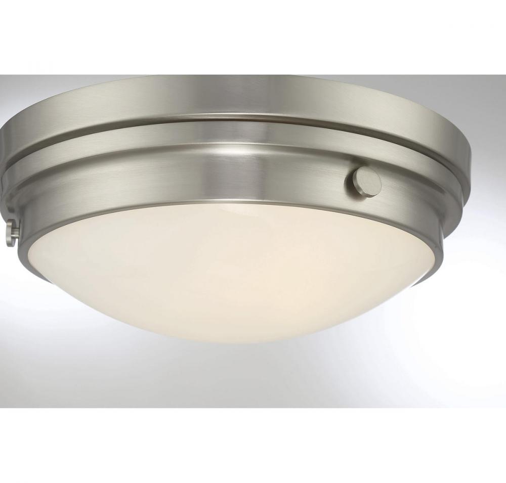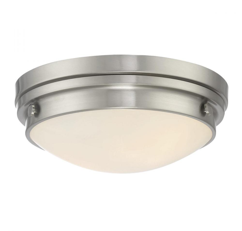 The Savoy House Lucerne 2-light ceiling flush mount is sure to bring sleek metallic style to any space! A white glass shade makes Lucerne an ideal choice for comfortable, useful light. Finished in sleek satin nickel. Flush mounts can be used on the ceiling of pretty much any interior room, including foyers, hallways, stairways, closets, bathrooms, bedrooms, kitchens and more! Bulbs not included. The satin nickel finish can be paired with nickel hardware or mixed with hardware in other finishes. Pep up the light and style of any room with Lucerne. When you choose a Savoy House lighting fixture, you can be certain you've selected a piece that will withstand the test of time.