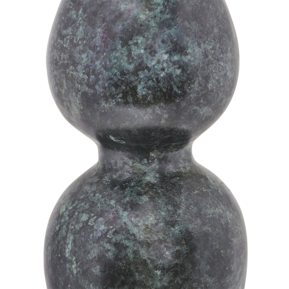 The Luganzo Small Bronze Vase has the undulant character of turned wood, but the sculpture is made of bronze with a jade green patina. A polished gold ring defines the culmination of its neck for a hint of sheen. The incredible distressing the artisans achieved with this vase after it has emerged during a lost-wax technique makes it a stunning textural piece that will read like an antique totemic accessory.