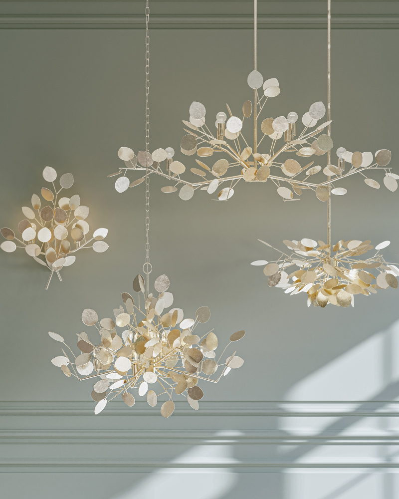 With a lyrical profile of fluttering discs that favor the leaves of its namesake plant, the Lunaria Wall Sconce is made of wrought iron in a contemporary silver leaf finish. The bulbs that are sprinkled amongst the flowing petals of metal reflect off the finish on this silver wall sconce to increase the glow.