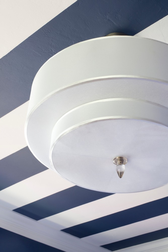 Features white silk shade with smoke acrylic beads. Convertible; can be installed as a chandelier or ceiling mount.