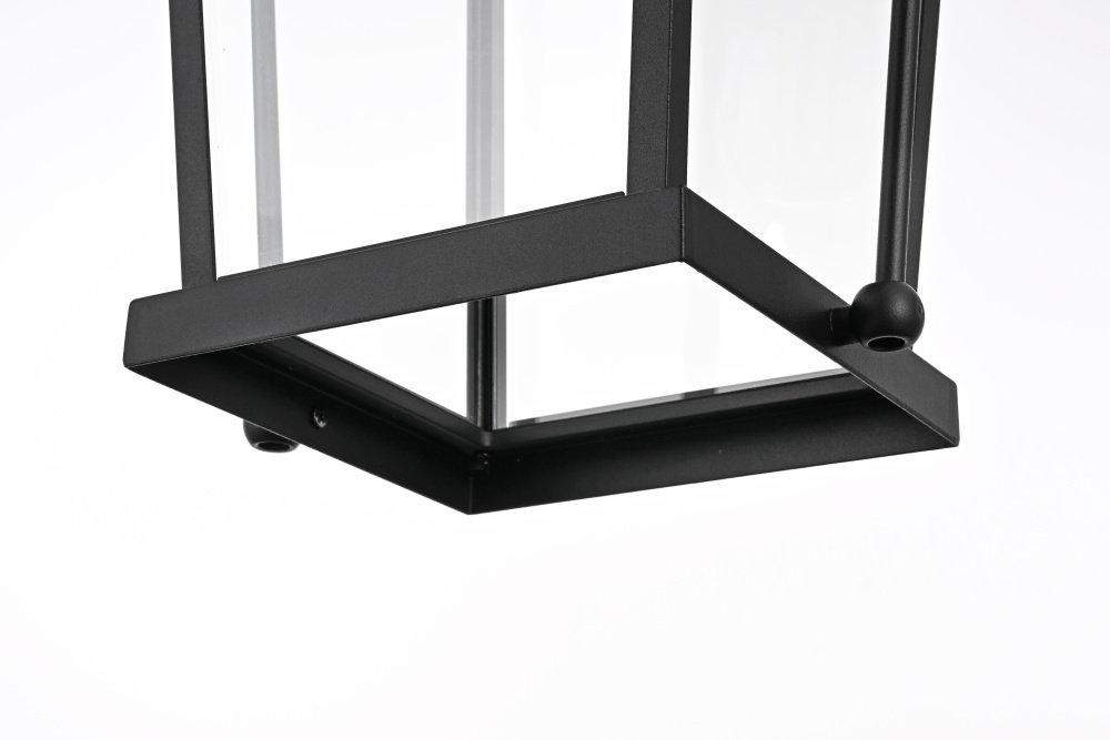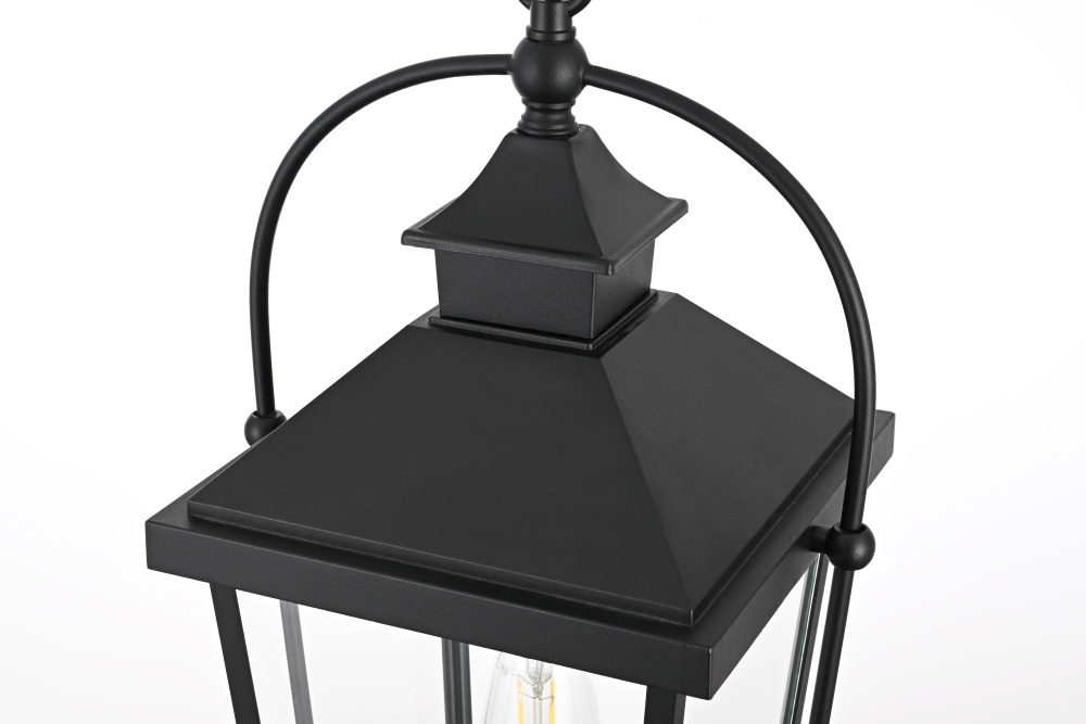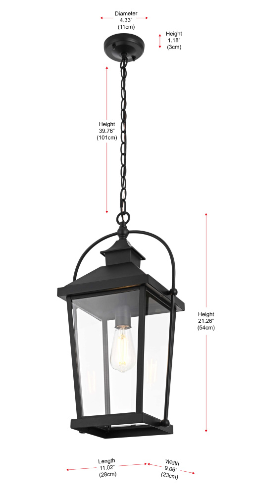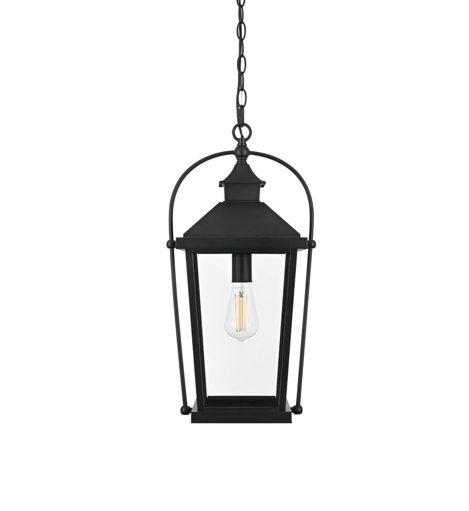 This hanging lantern pendant combines a structured metal frame with clear glass panels, offering a classic yet functional design for outdoor spaces. The tapered rectangular shape with a pitched roof gives it a traditional lantern look, while the black-finished iron and aluminum construction ensures durability. Designed for versatility, it comes with a 59-inch adjustable chain, allowing for a hanging height between 25.5 and 63 inches to fit various spaces. The open-bottom design makes bulb changes effortless, while the dimmable function offers customizable brightness when paired with a compatible dimmer. This fixture uses one medium-base E26 bulb (40W max, not included) and is ETL damp Rated, making it ideal for porches, patios, and outdoor walkways. Hardwired for stability, this pendant blends traditional craftsmanship with modern functionality. Built with marine-grade, corrosion-resistant aluminum, this sconce withstands coastal conditions for long-lasting durability.