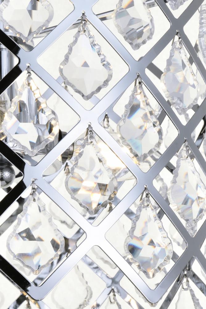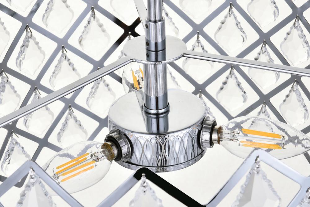 Tiers of clear multi-faceted crystals reflect the soft glow of candelabra bulbs