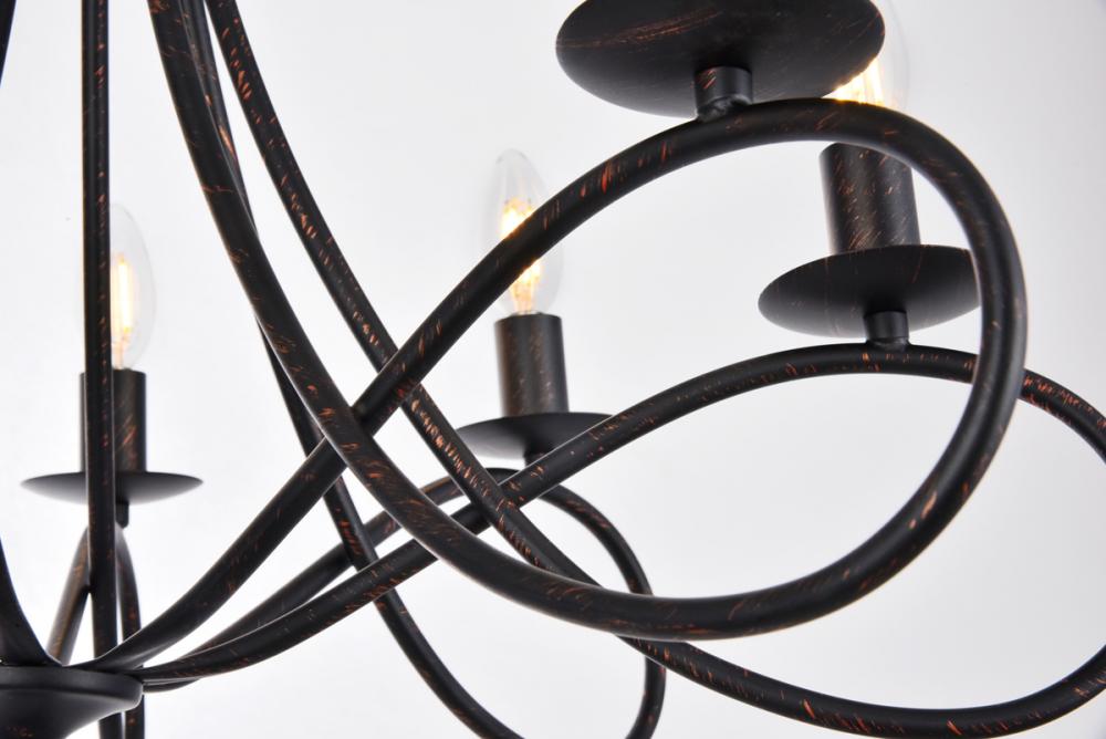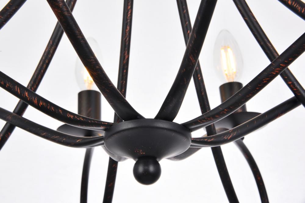 Lamp features a diameter of 28 inches, a height of 23 inches, a minimum hanging length of 29 inches, a maximum hanging length of 83 inches, and requires 8 candelabra bulbs