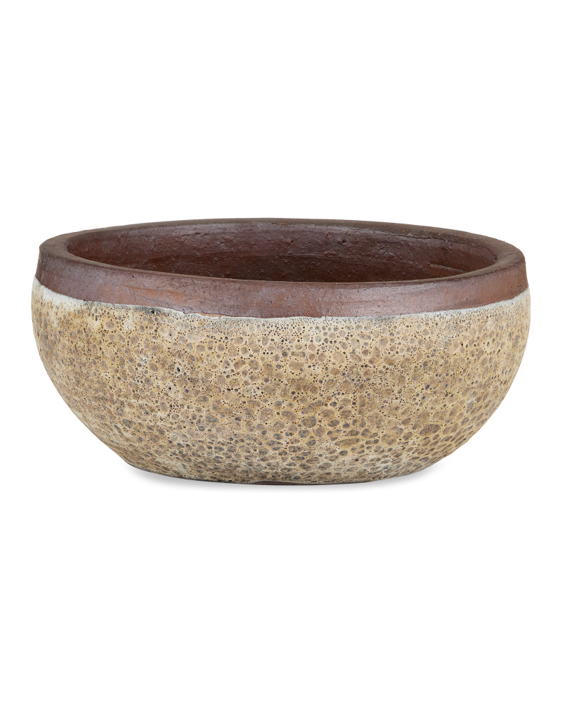 The Lyra Beige Small Planter is a bowl-shaped garden planter with a surface that looks like it has fissures and craters in it thanks to the incredible reactive cream glazing that was applied after the vessel was fired. There is a mottling on the surface of the tan planter that brings it an incredible texture. The Lyra has a drain hole, though the vessel does not come with a plug.