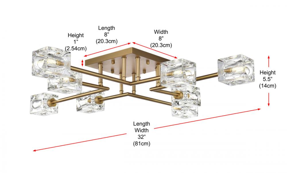 Effortlessly elegant, our Lyra 32-inch flush mount redefines your space, projecting eight lights each adorned with distinctive dimpled square glass for a dynamic touch. Crafted with durability in mind, the iron base adds a hint of industrial elegance. Its flush design hugs the ceiling, combining style with space-saving practicality. Enjoy easy assembly and a 360-degree beam spread, casting warm and inviting light throughout your space. Illuminate with Lyra's timeless radiance.