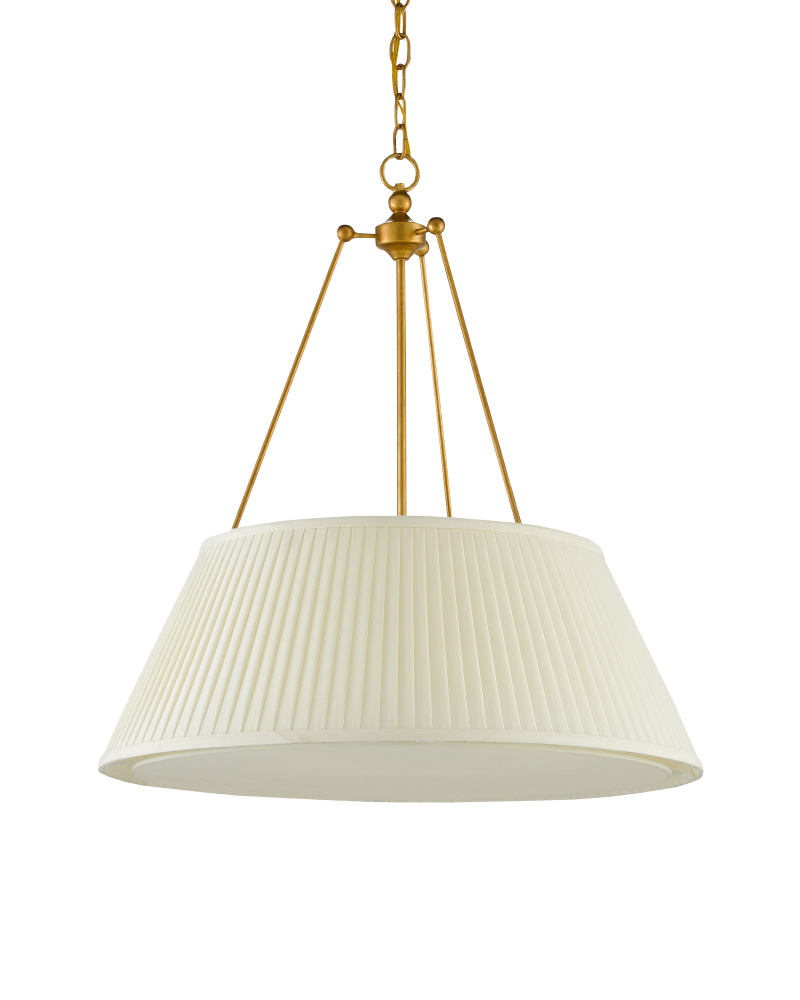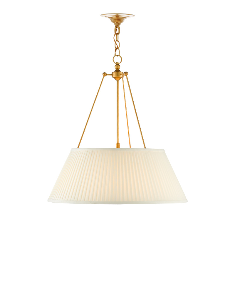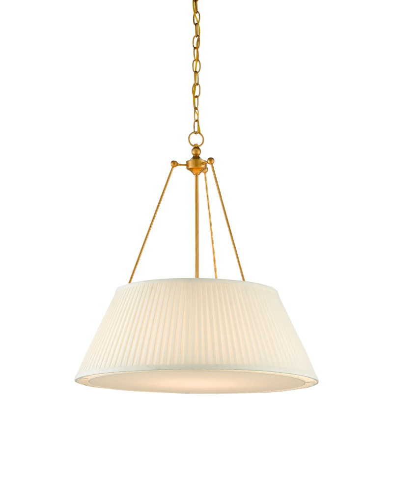 Though the Lytham Pendant has nostalgic references to hanging fixtures from the age of Americana, the length of the frame that extends down to hold the shade brings a fresh, modern feel to this gold pendant. Made of wrought iron in an antique gold leaf finish, the pendant light with pleated shade gleams bright. Adjustable from 32.5" to 100.5" with use of included chain/rod kit/cable. If your space calls for a longer drop, additional chain/rods/cable is available for purchase.