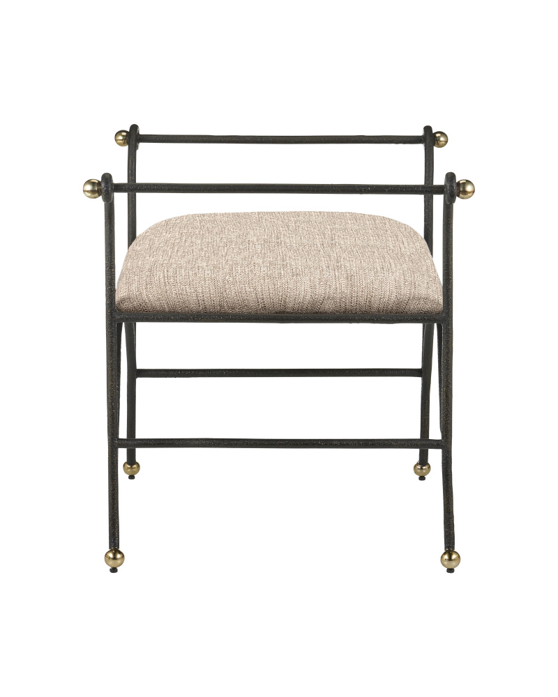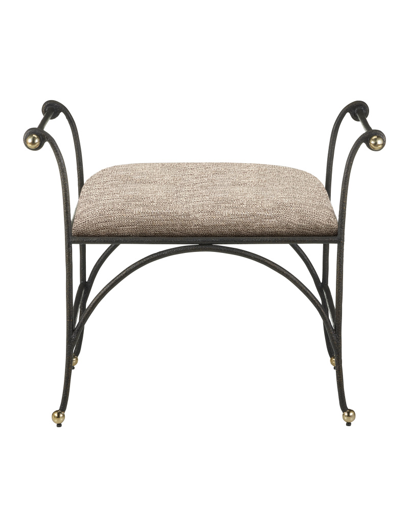 The Mabel Ottoman is a classic design constructed of textured steel, which has a light gold rub that shows through. Special accents are the polished brass stainless steel ball feet and arm details, as well as the way the stretchers arc up toward the seat. The upholstered top is covered in a woven brown-beige performance fabric, and the seat is a generous 22 inches wide.