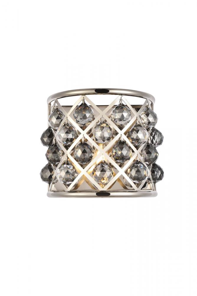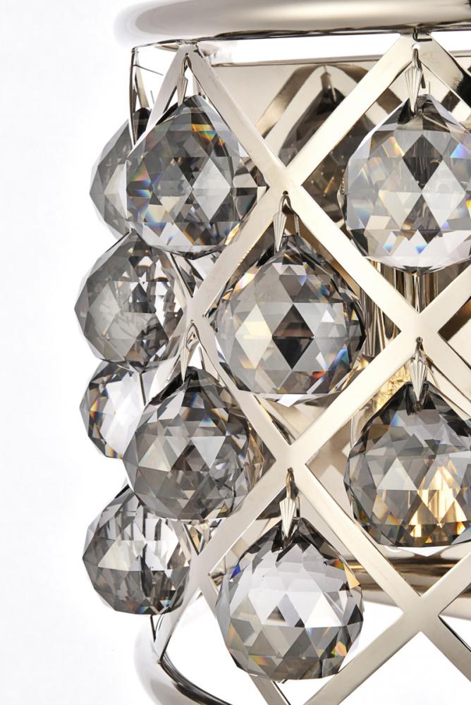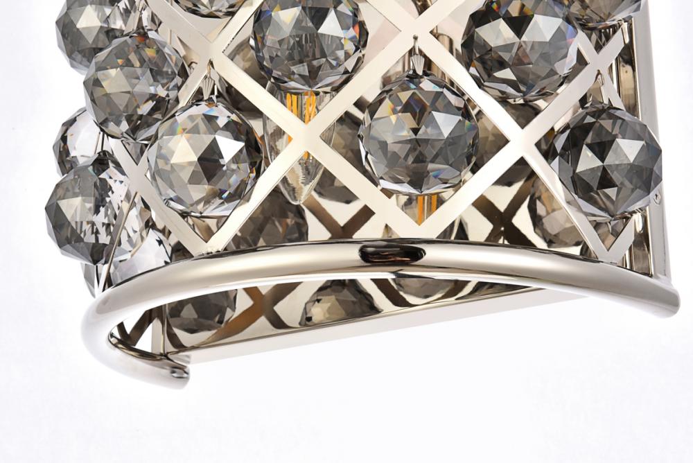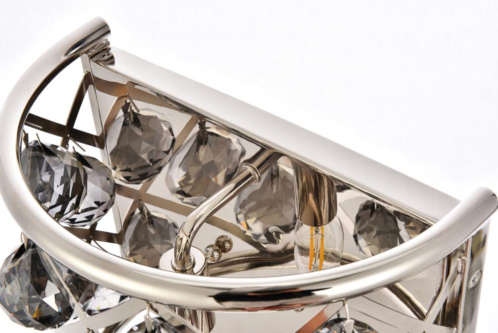All the delicate beauty of a soap bubble paired with the steadfast strength of steel and iron. Madison collection wall sconces add the right touch of radiance that's ideal for a hallway, bedroom, or bathroom. Semicircular forged-iron grid and steel backplate available in golden-iron, mocha-brown, and polished-nickel finishes. Hand-polished, multi-faceted crystal spheres available in clear give these wall sconces the perfect finishing touch.
