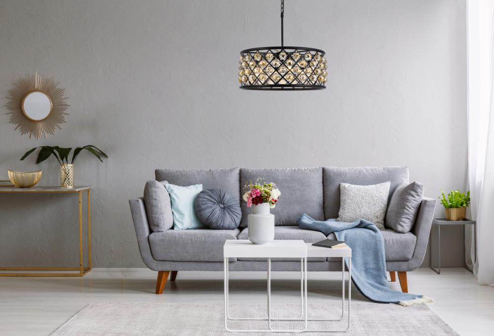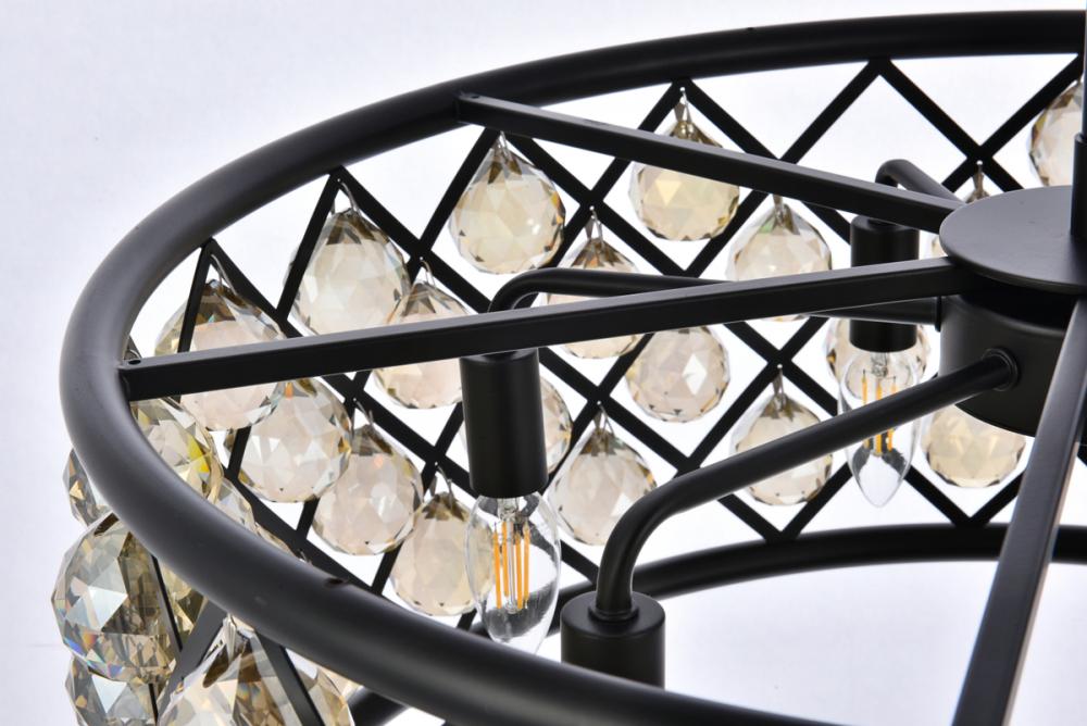 Lamp features a diameter of 25 inches, a height of 10.5 inches, a minimum hanging length of 16 inches, a maximum hanging length of 70 inches, and requires 6 candelabra bulbs