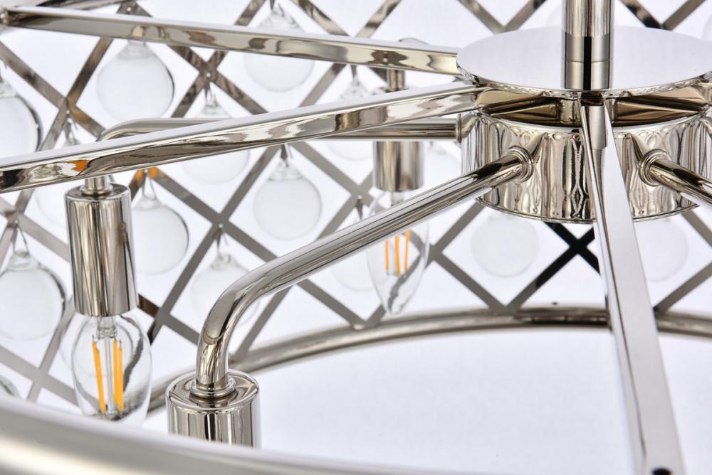Lamp features a diameter of 25 inches, a height of 10.5 inches, a minimum hanging length of 16 inches, a maximum hanging length of 70 inches, and requires 6 candelabra bulbs