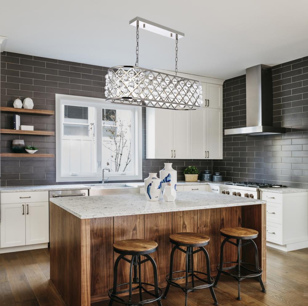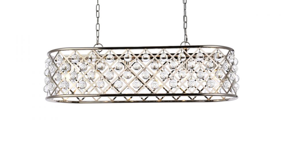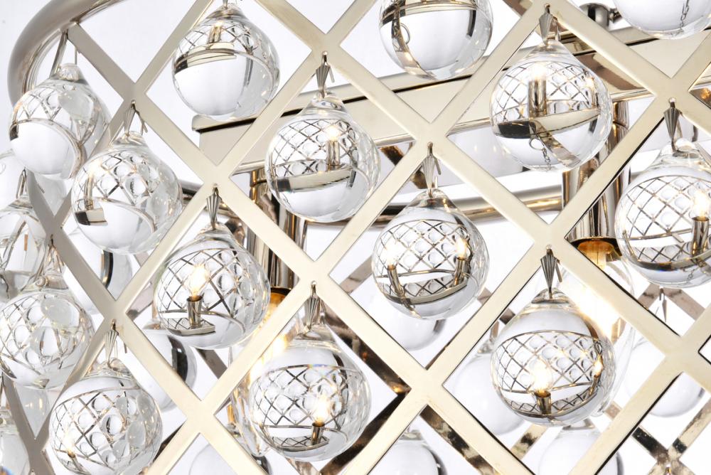 Modern simplicity meets organic beauty in the breathtakingly unique Madison collection. Hand-polished, multifaceted clear crystal spheres shimmer like dewdrops in an oblong forged-iron grid with a golden-iron, mocha-brown, or polished-nickel finish. These airy chandeliers will brighten up a kitchen, dining room, foyer, or stairwell in an explosion of reflected light.