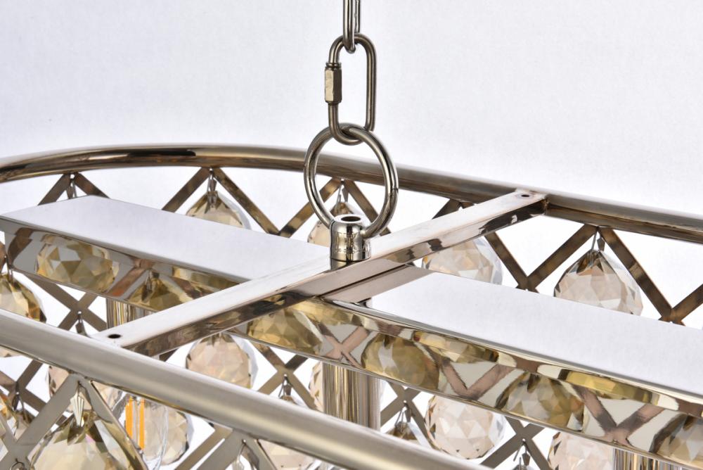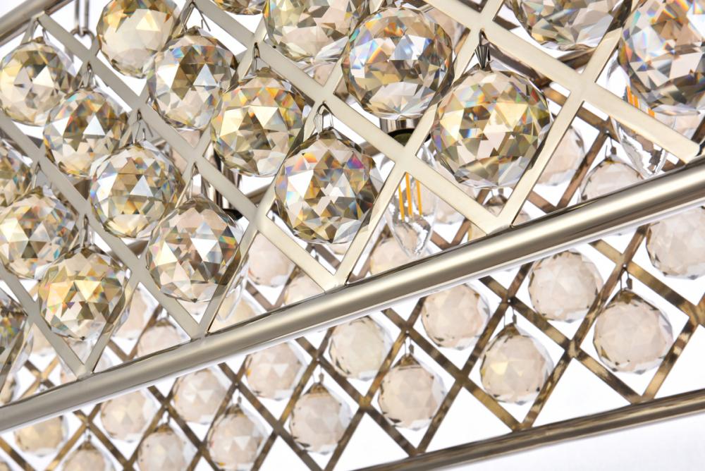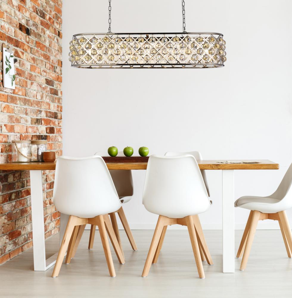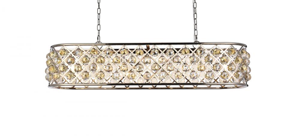 Modern simplicity meets organic beauty in the breathtakingly unique Madison collection. Hand-polished, multifaceted clear, golden-teak, or Silver-shade crystal spheres shimmer like dewdrops in an oblong forged-iron grid with a golden-iron, mocha-brown, or polished-nickel finish. These airy chandeliers will brighten up a kitchen, dining room, foyer, or stairwell in an explosion of reflected light.