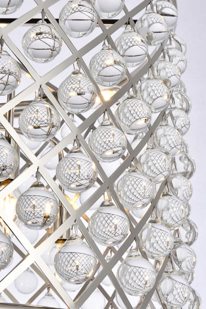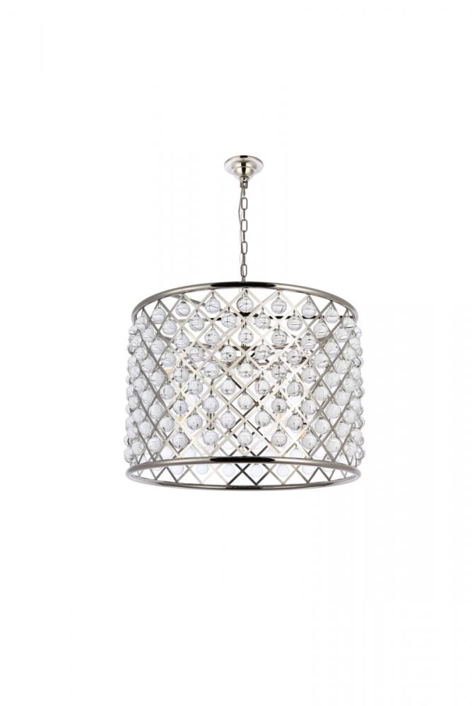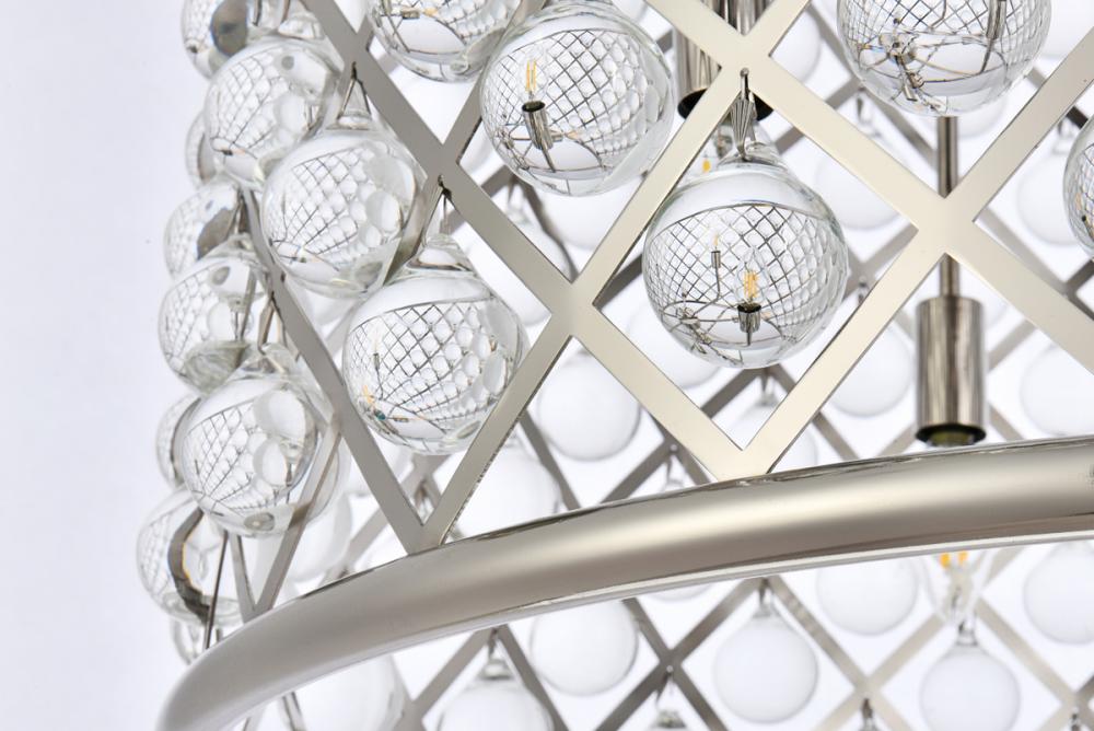 Modern simplicity meets organic beauty in the breathtakingly unique Madison collection. Hand-polished, multifaceted clear crystal spheres shimmer like dewdrops in a circular forged-iron grid with a golden-iron, mocha-brown, or polished-nickel finish. These airy pendant lamps will brighten up a kitchen, dining room, foyer, or stairwell in an explosion of reflected light.