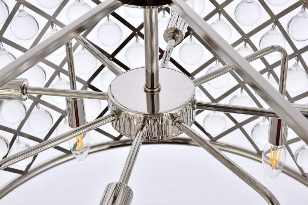 Lamp features a diameter of 27.5 inches, a height of 21 inches, a minimum hanging length of 27 inches, a maximum hanging length of 81 inches, and requires 8 candelabra bulbs