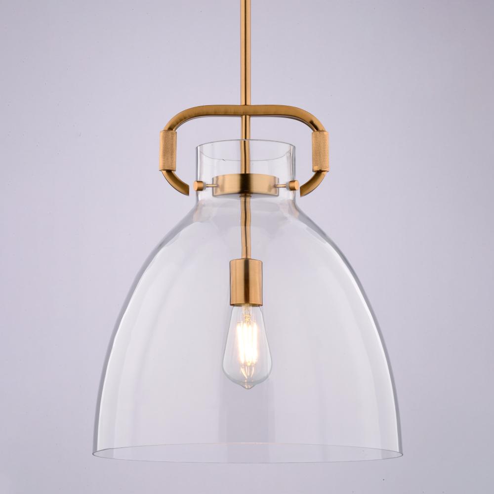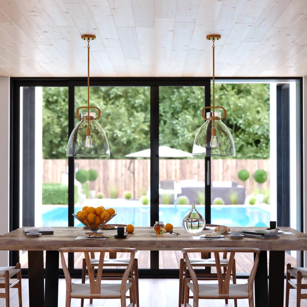 Add a touch of modern industrial style to your kitchen island or dining nook with the Madrona pendant. Its clear glass bell-shaped shade and industrial ring top with knurled metal accents create a unique and eye-catching statement. The muted brass finish adds warmth and sophistication, elevating your home's style without breaking the bank.