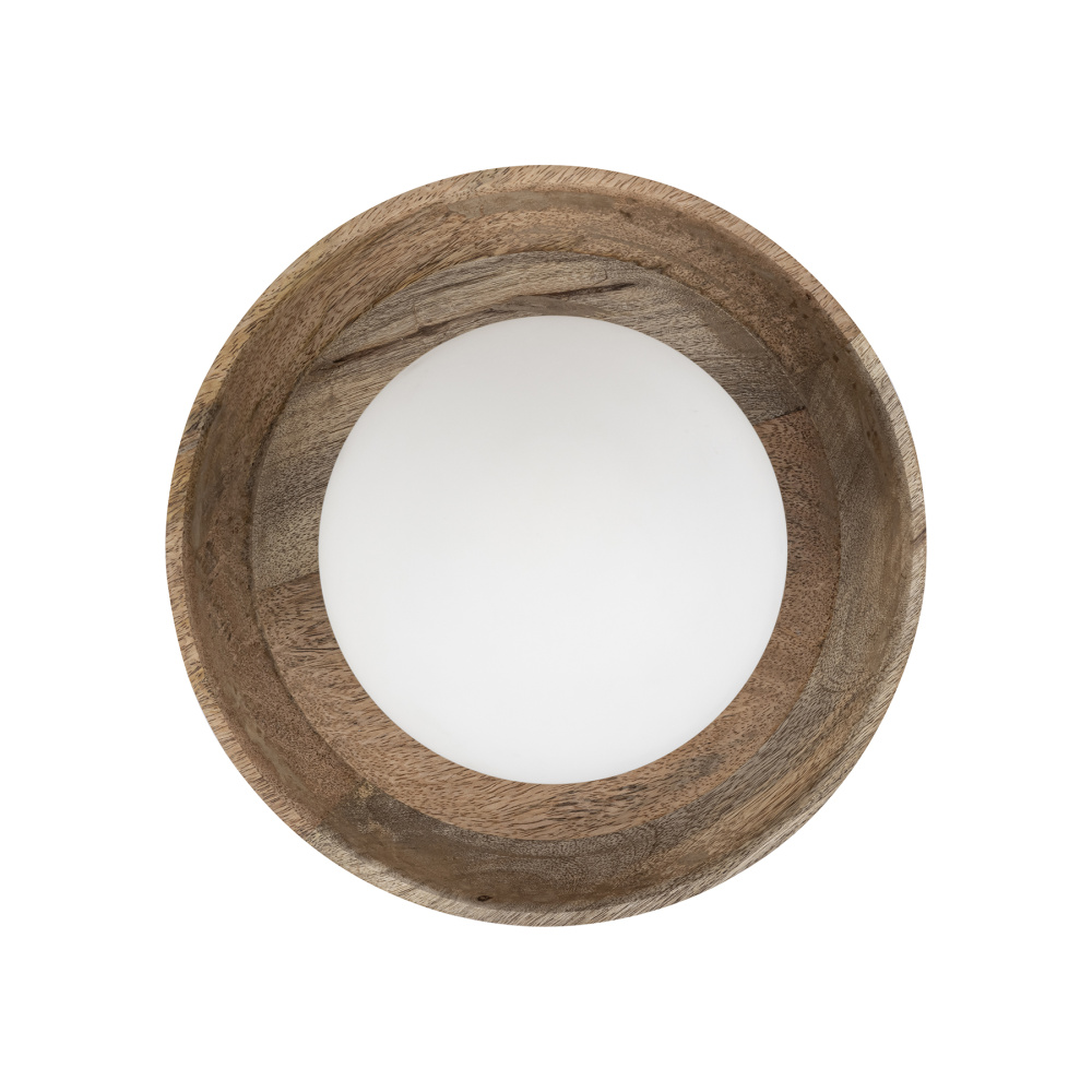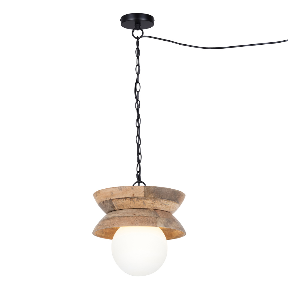 The MAEVA swag pendant combines contemporary postmodern style with nature-inspired materials. A smooth mango wood shade surrounds an opal glass globe, providing soft, balanced lighting that feels calming and restorative. At 10 inches wide, this single-light pendant is compact yet eye-catching, adding subtle luxury to kitchens, living rooms, or covered patios. The included swag kit includes a 5-foot chain, an 18-foot cord, and an on/off switch for versatile placement; no hardwiring required. Damp-rated for covered outdoor patios and indoor use, MAEVA blurs the line between lighting, art, and nature. With its warm wood tones, muted curves, and sculptural shape, this pendant fixture effortlessly enhances modern interiors.