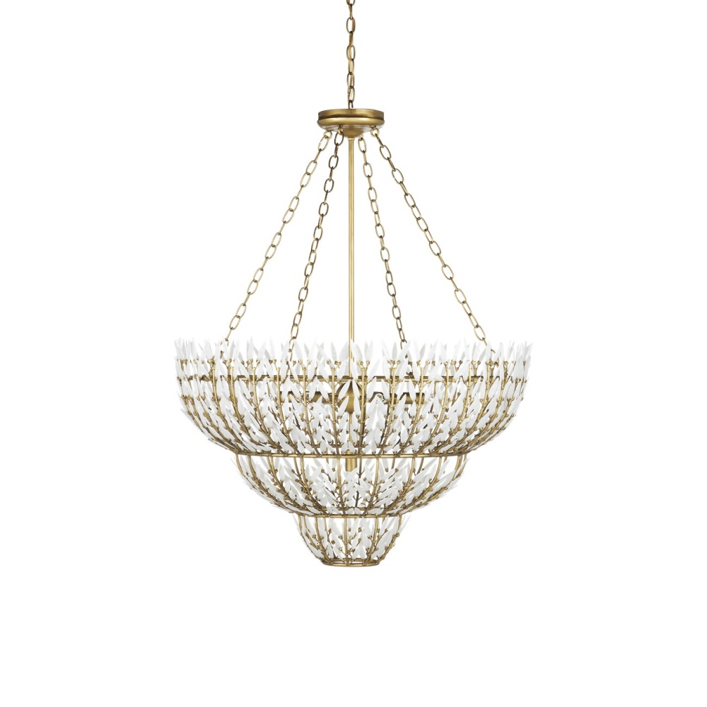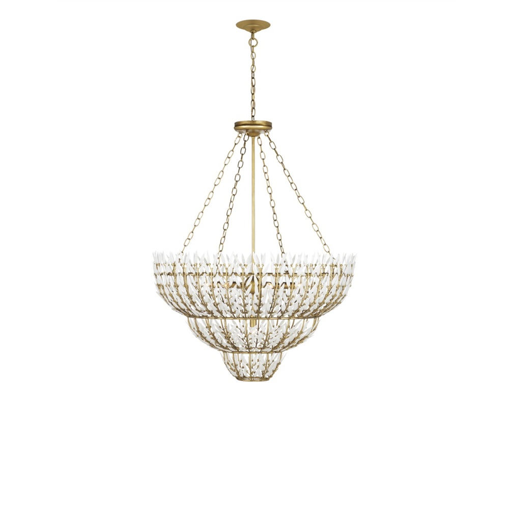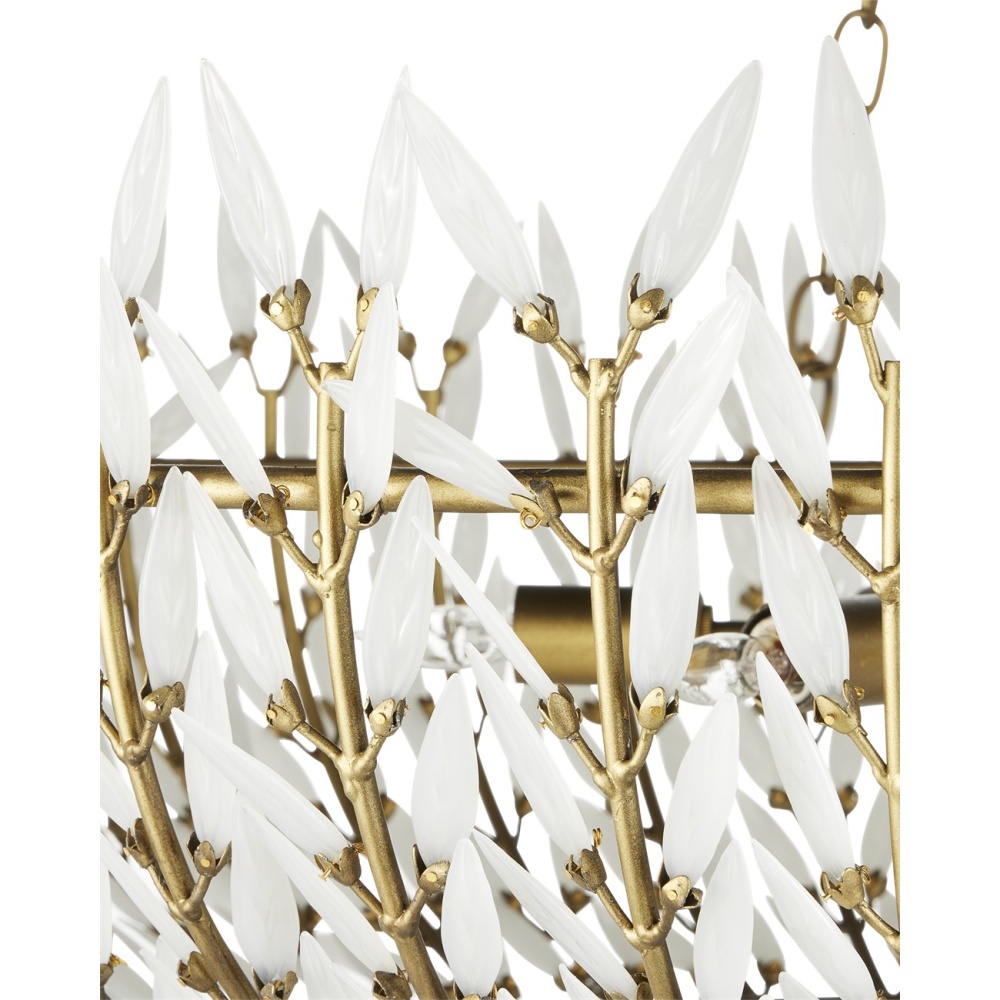 The Magnum Opus Large Chandelier is a clean-lined version of a vintage design, meticulously conceived to bring elegance to any space. The rows of glass leaves attached to the three-tier metal stems effervesce when light strikes them to create a stunning sculptural fixture. The white glass also beautifully contrasts the metal in a brass finish, the cool/warm contrast bringing the gold chandelier a heightened level of texture. The beautiful white glass leaves also surround the seven bulbs on this fixture to infuse a space with a lovely glow. Adjustable from 48.5" to 116.5" with use of included chain/rod kit/cable. If your space calls for a longer drop, additional chain/rods/cable is available for purchase.