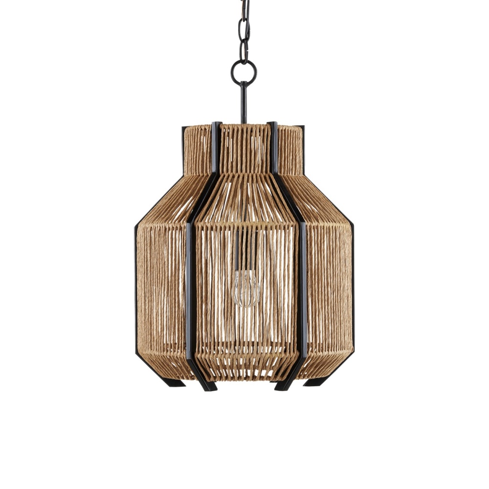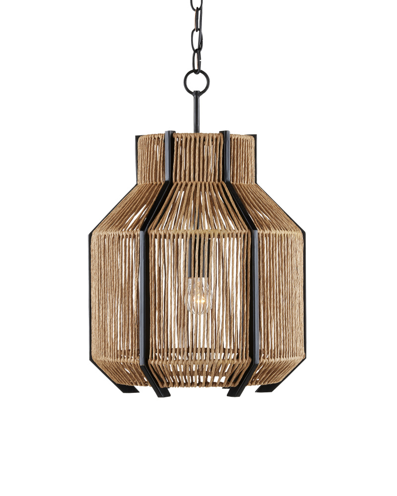 The Mali Pendant has a complex interplay of sleek and earthy elements. The lines that rise above and below the natural woven shade of the rope pendant are made of wrought iron in a satin black finish, as are the chain from which it is hung and the hardware that holds the bulb. These are the clean-lined elements that contrast the Kraft paper twine, which is tightly woven but not so dense that it interrupts the warm glow of illumination from its interior. Adjustable from 25" to 93" with use of included chain/rod kit/cable. If your space calls for a longer drop, additional chain/rods/cable is available for purchase.