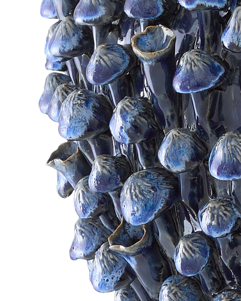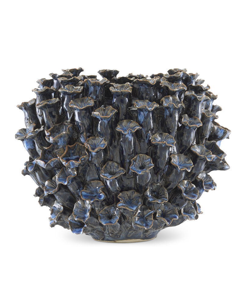 Our Manitapi Small Blue Vase is made by a group of women who live at the border of Burma and Thailand. Made from black terracotta, this incredible hand-thrown, dark blue vase is completely covered in handmade bell-shaped flowers. Once the blossoms are in place, the vase is glazed with a rich deep blue.