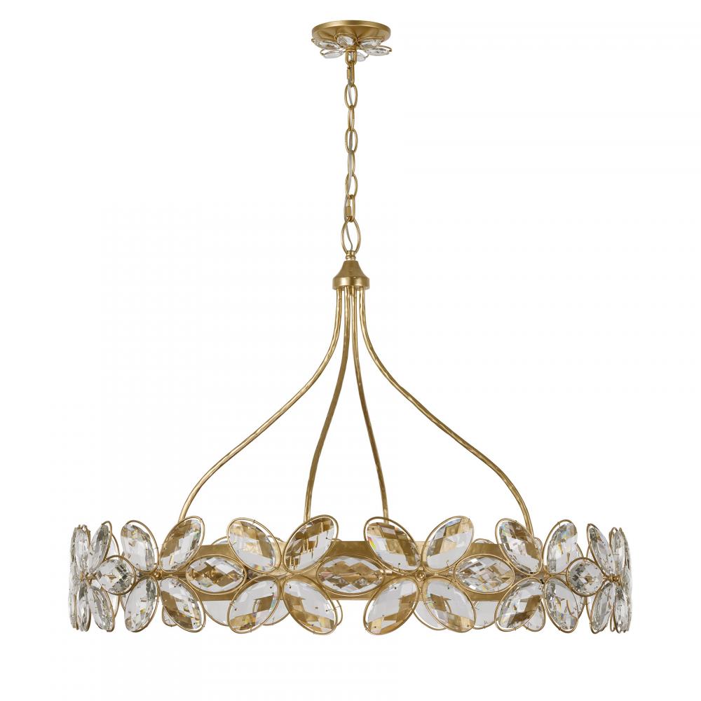 The Savoy House Marbella 14-light chandelier was designed by Breegan Jane, an award-winning interior designer and TV host. Breegan loves to travel to Spain and, accordingly, Marbella is named after a seaside Spanish city that boasts a significant archaeological heritage and pleasant coastal climate! Marbella has an elegant design that recalls fashionable bangle bracelets, its hammered metal adorned with flowers crafted from faceted K9 crystal. Another crystal flower also blossoms from the ceiling canopy! The hand-applied Gold Shimmer finish simply accentuates the beauty. Marbella is 28" in height and 36" in width. It uses fourteen candelabra size bulbs of up to 60 watts per bulb. Bulbs not included. Comes with 120" of chain.