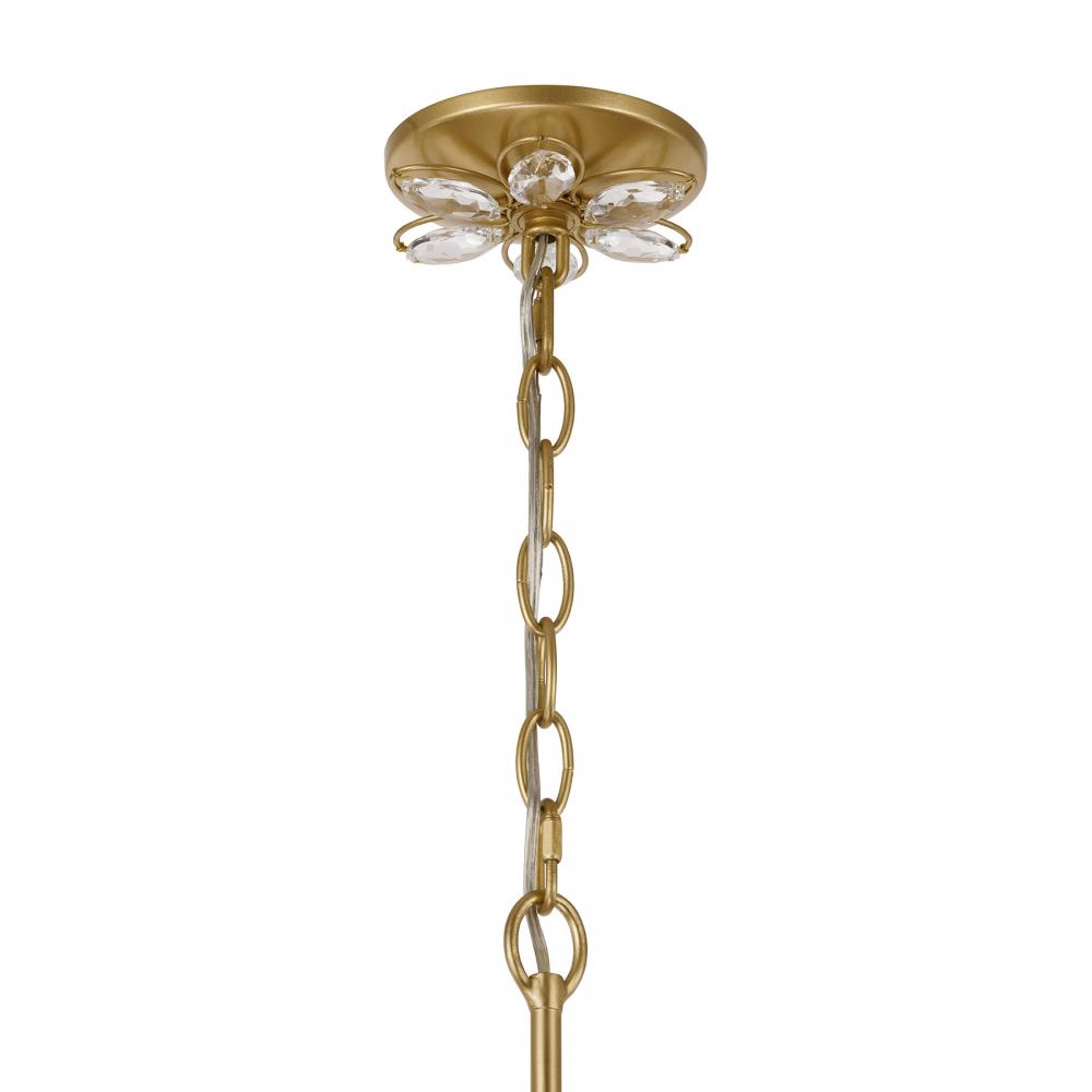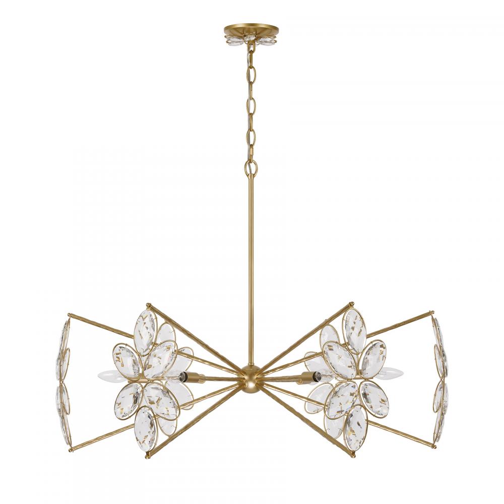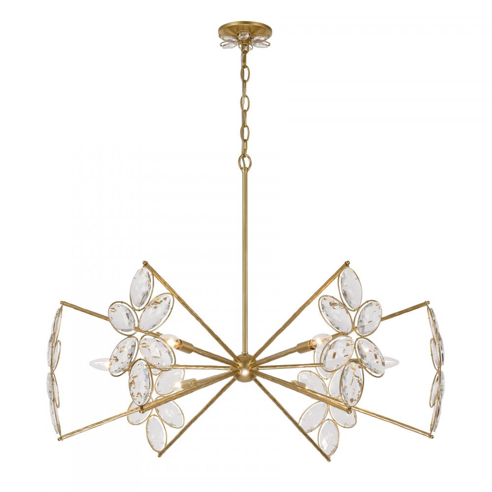 The Savoy House Marbella 6-light chandelier was designed by Breegan Jane, an award-winning interior designer and TV host. Breegan loves to travel to Spain and, accordingly, Marbella is named after a seaside Spanish city that boasts a significant archaeological heritage and pleasant coastal climate! This delicate, elegant design is decorated with sparkling K9 crystal flowers and finished in hand-applied Gold Shimmer. Marbella is 28.25" in height and 36" in width. It uses six candelabra size bulbs of up to 60 watts per bulb. Bulbs not included.