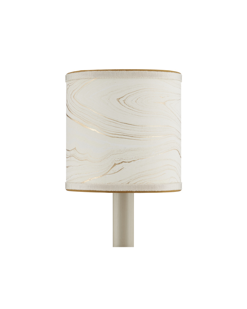 Petite shades are an easy way to bring added style to a space while also introducing color and texture, particularly when they are made from artisanal marbleized paper and ornamented with two layers of grosgrain ribbon in different hues. The saturation of the colors on the handmade tapered and cylindrical shades for chandeliers and wall sconces is achieved by a New England atelier. Patterns will vary because they are created during a very organic process that makes any surface treated to marbleizing so special. There are both vivid and pastel patterns in this collection, as you can see from this subtly swirling cream and gold version of the drum shade. Top Diameter: 5" Bottom Diameter: 5" Height: 5"