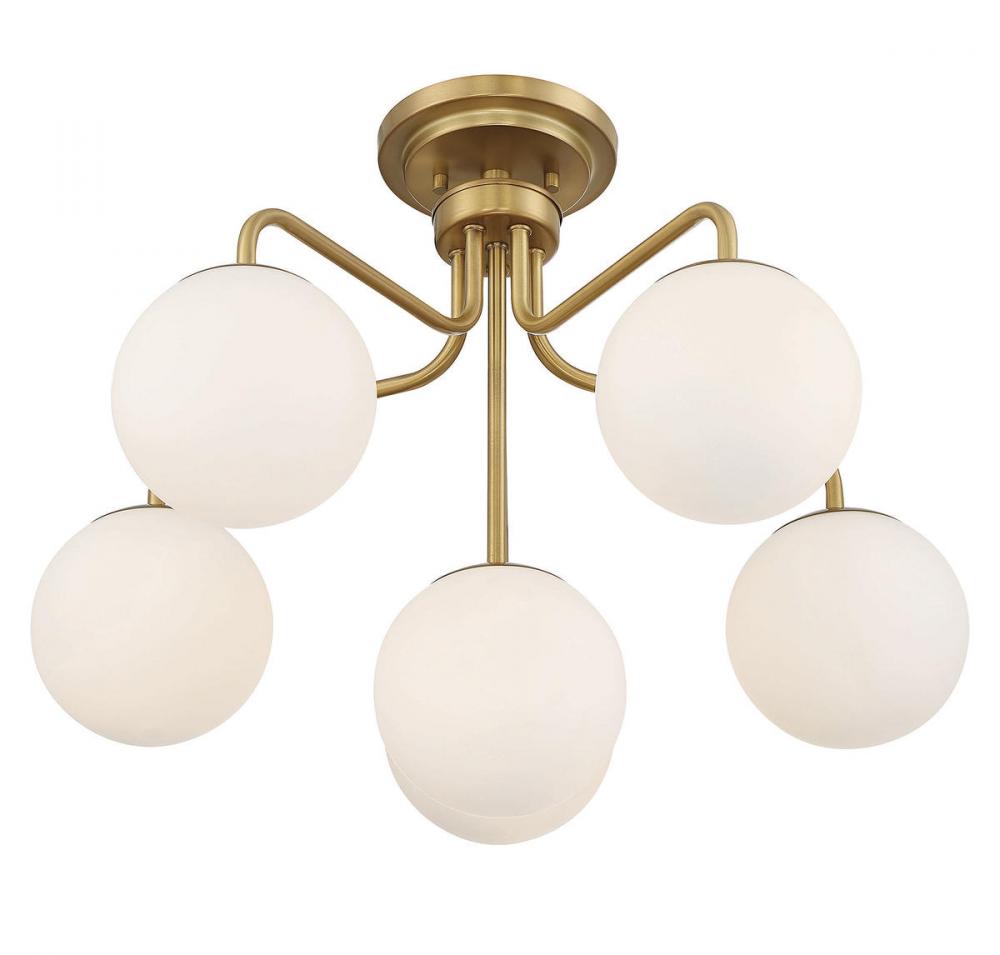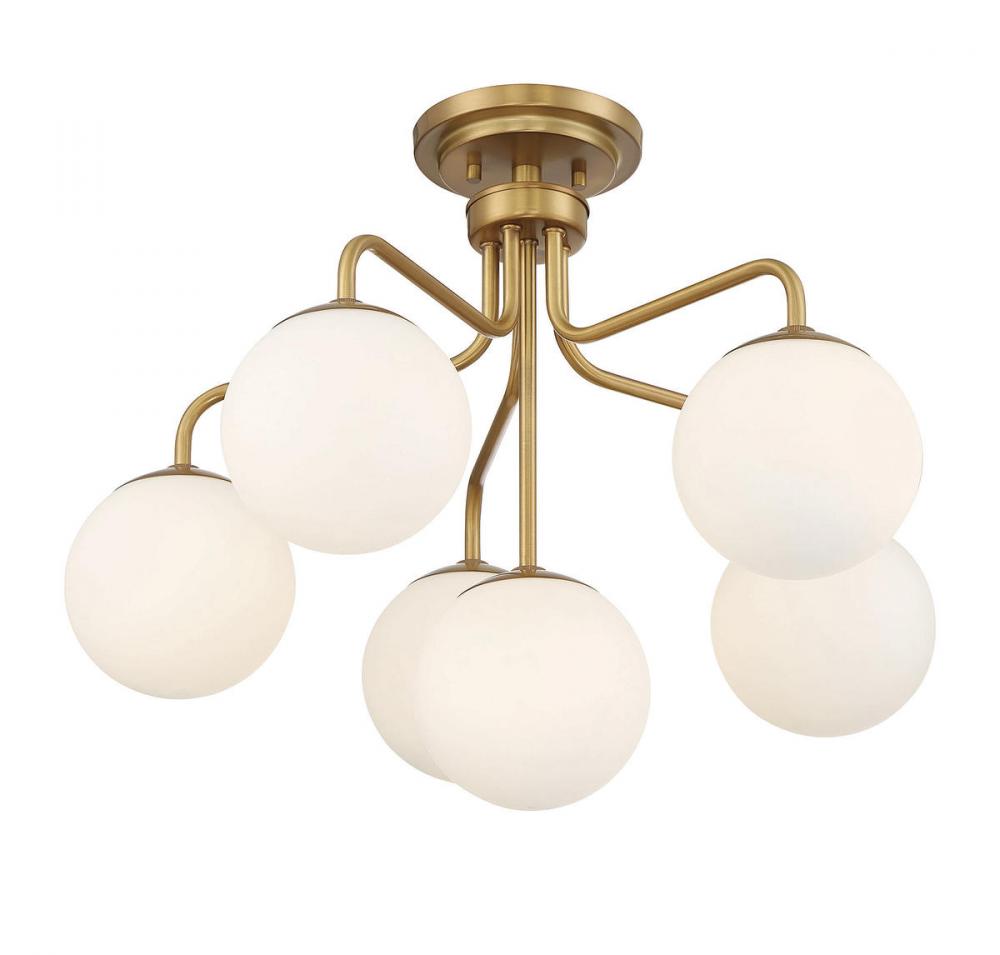 The Savoy House Marco 6-light ceiling light delivers a sleek lighting look that is inspired by midcentury modern style. A minimal design finished in warm brass keeps the focus on the light coming from shades of clear glass. Marco is 18.25" in height and 24" in width. It uses six candelabra size bulbs of up to 60 watts per bulb.
