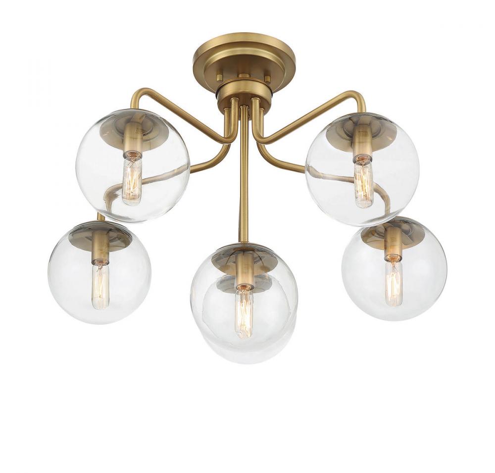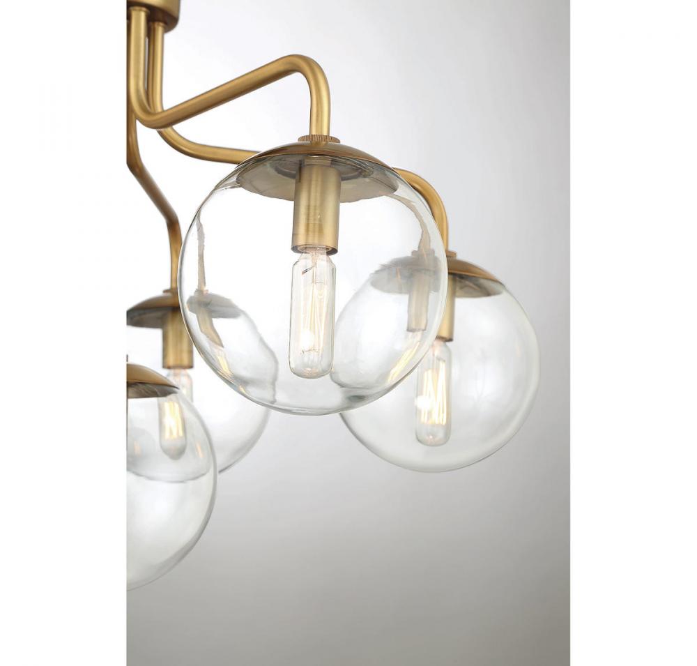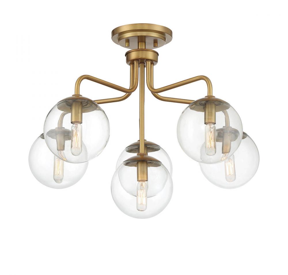 The Savoy House Marco 6-light ceiling light delivers a sleek lighting look that is inspired by midcentury modern style. A minimal design finished in warm brass keeps the focus on the light from shades of white opal glass. Marco is 18.25" in height and 24" in width. It uses six candelabra size bulbs of up to 60 watts per bulb.