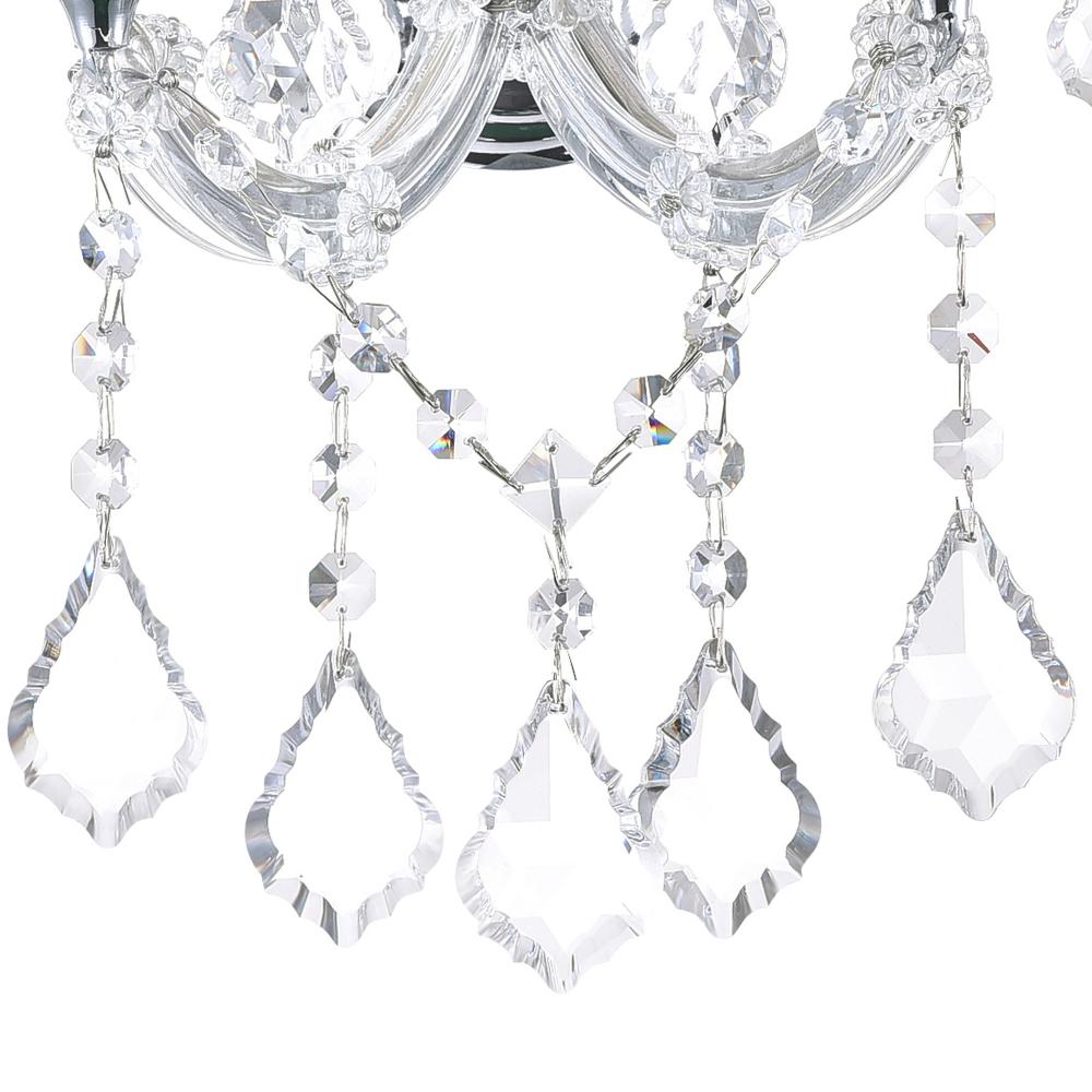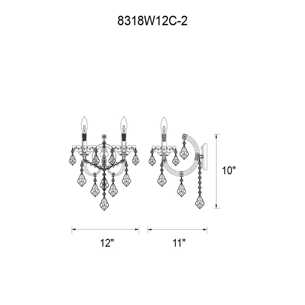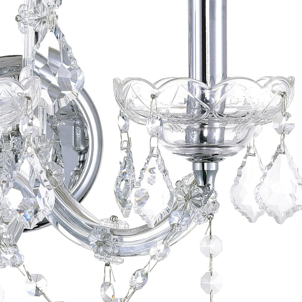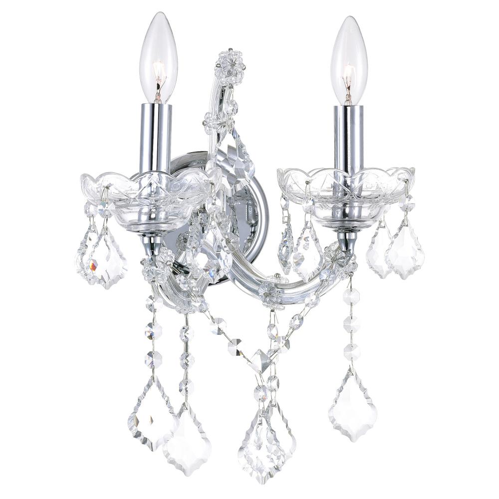 Add a touch of classic charm and radiant warmth to your living room, dining room, hallway, or bedroom with the Maria Theresa 2-Light Wall Sconce. Designed to mimic the soft glow of candlelight, this exquisite sconce combines vintage inspiration with modern sophistication. Crafted with a sleek chrome-plated finish, its gracefully curved candelabra arms are adorned with dangling and draping clear crystals, creating a dazzling play of light and reflection. Perfect for traditional or transitional interiors, this wall light effortlessly enhances your space with timeless beauty.