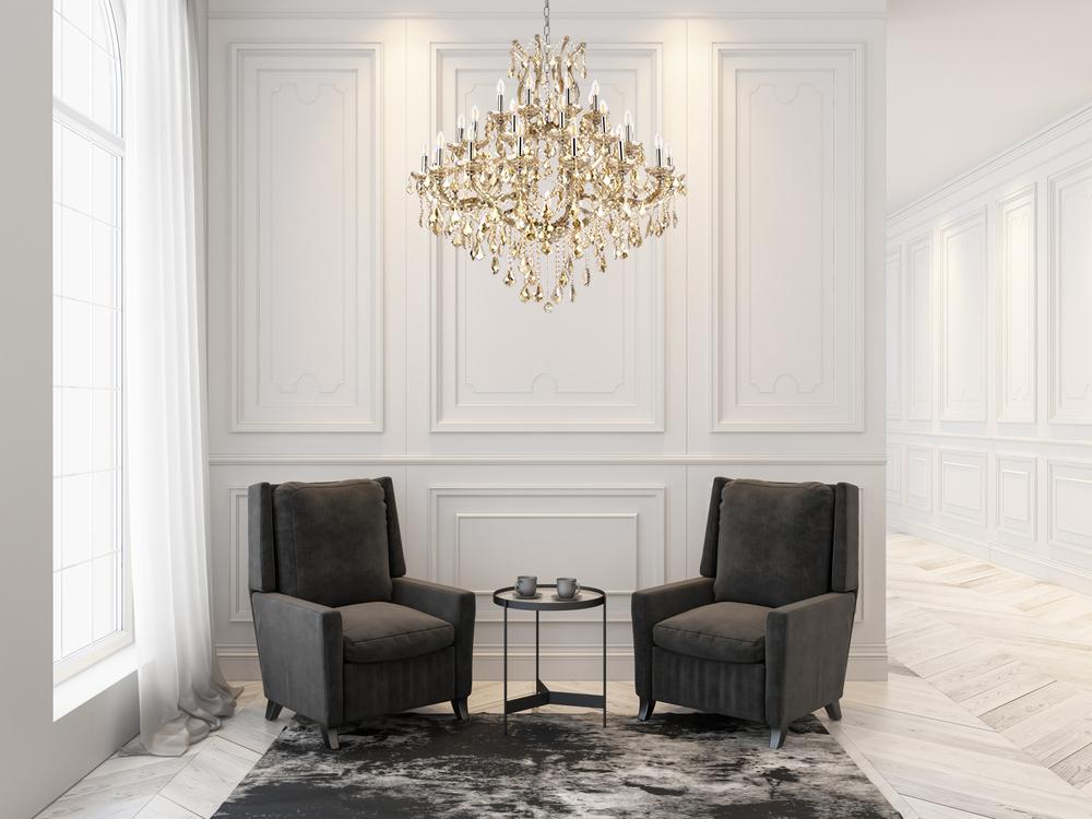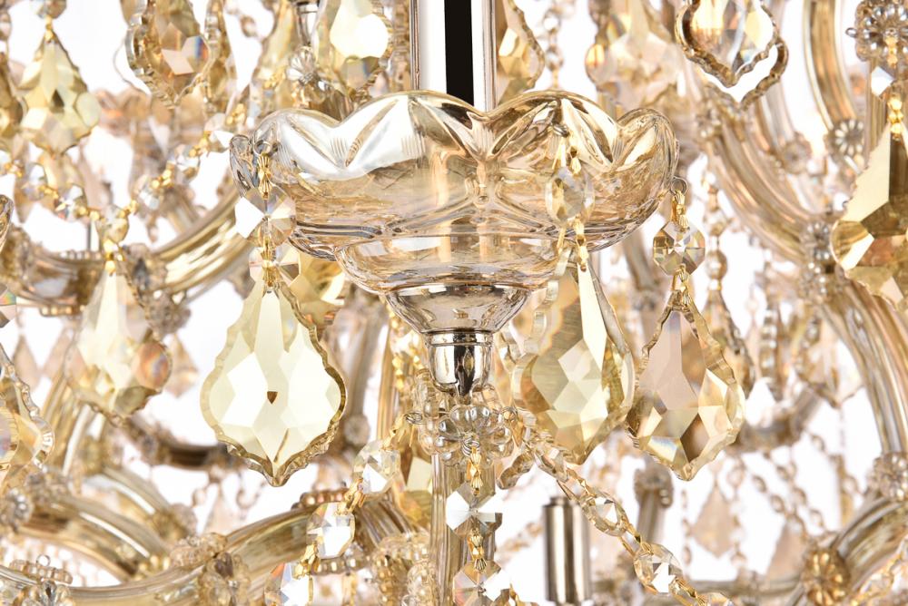 A heavenly high point to your home, Maria Theresa collection pendant lamps are ablaze with hundreds of resplendent crystals. Copious strands of sparkling clear or golden-teak crystals dangle from elaborate tiers of glass-coated steel arms in your choice of a chrome, gold, golden-teak, white, or black finish. An imperial favorite for the stairwell, dining room, or living room.