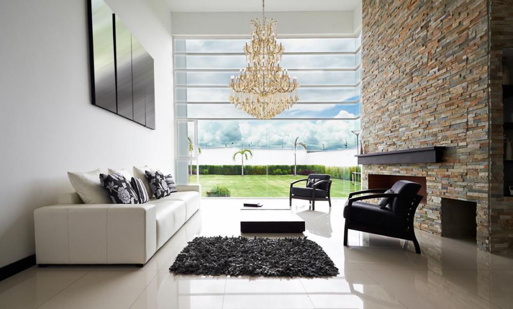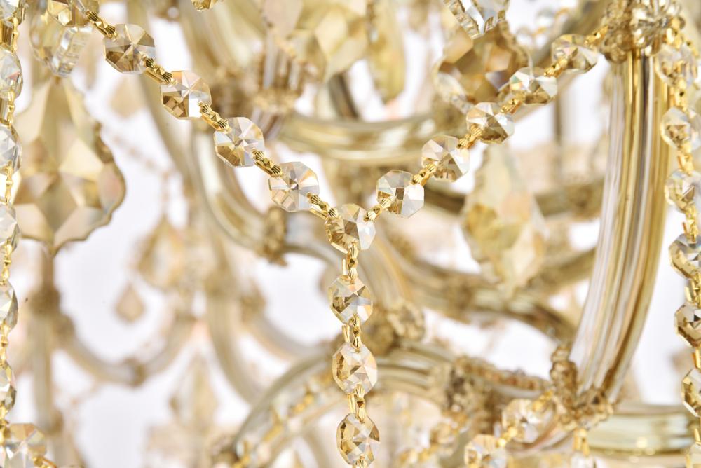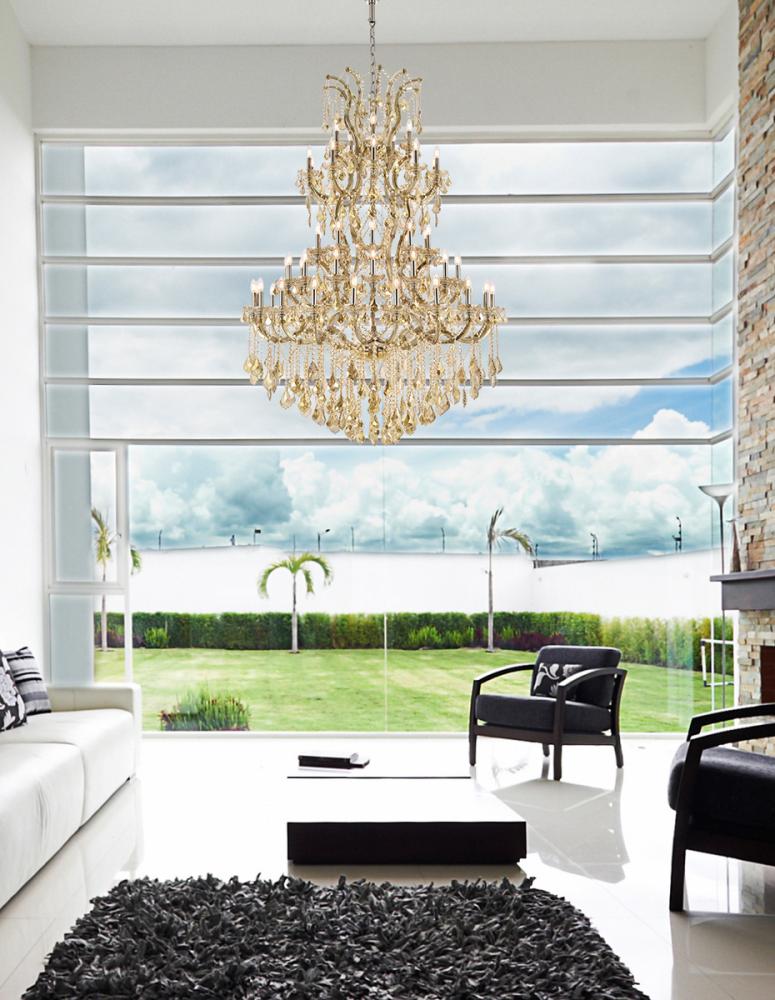 A heavenly high point to your home, Maria Theresa collection pendant lamps are ablaze with hundreds of resplendent crystals. Copious strands of sparkling clear or golden-teak crystals dangle from elaborate tiers of glass-coated steel arms in your choice of a chrome, gold, golden-teak, white, or black finish. An imperial favorite for the stairwell, dining room, or living room.