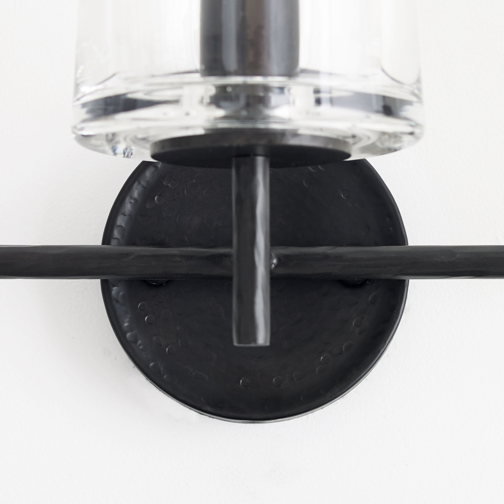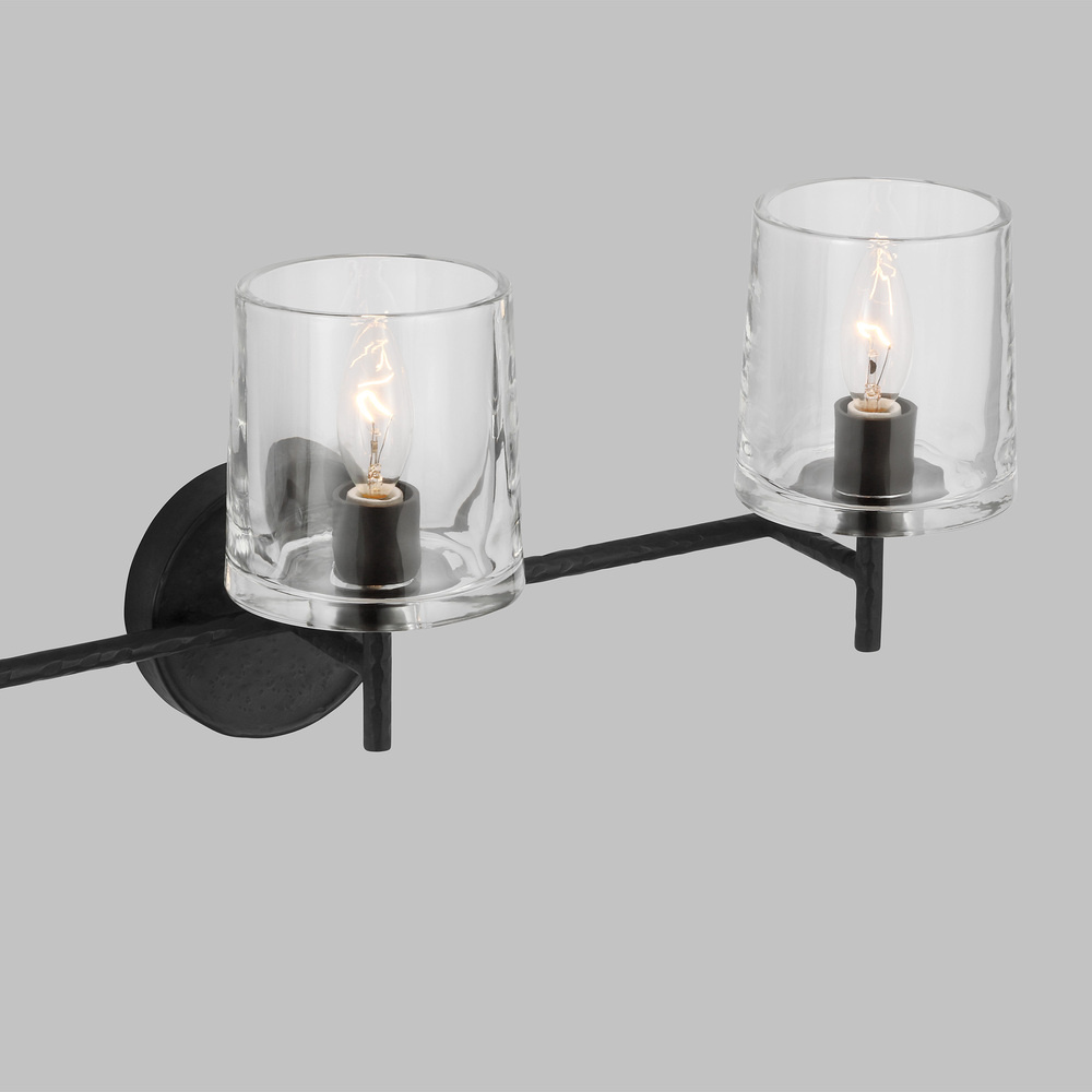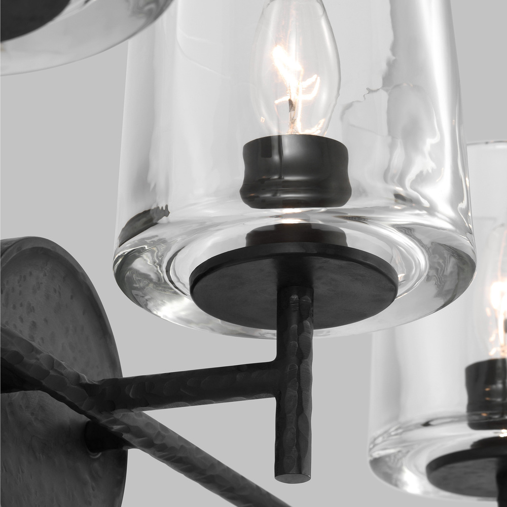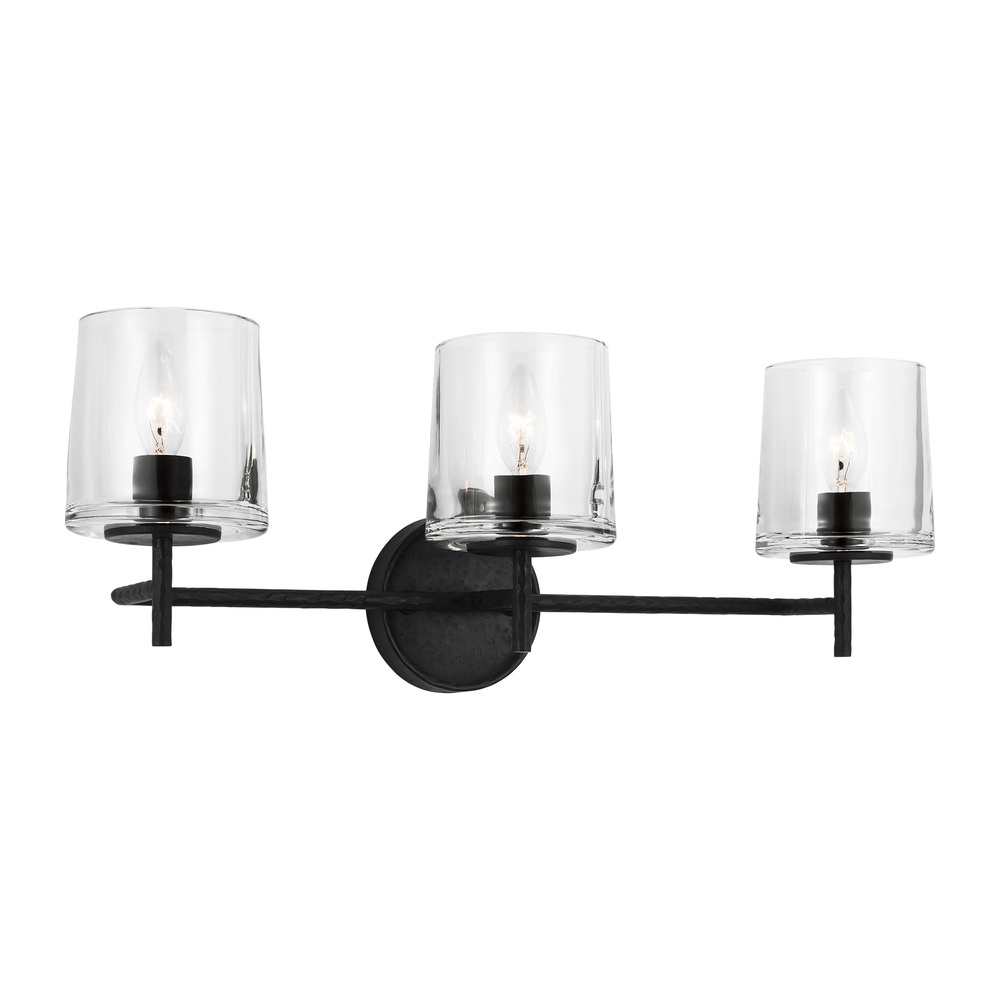 The Marietta three light vanity fixture in Aged Iron embodies Industrial charm with Midcentury flair, the Marietta vanity series features curved arms and mouth blown glass. This streamlined vanity series is crafted in an Aged Iron hammered iron finish that is simple yet timeless. Sophisticated and modern with an industrial edge, this sconce boasts a classic look that works well in any decor.
