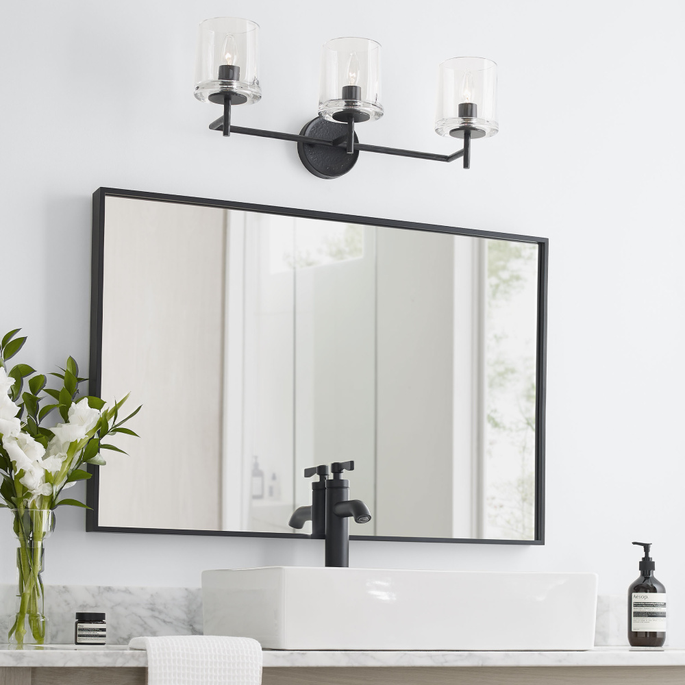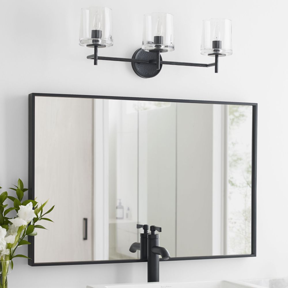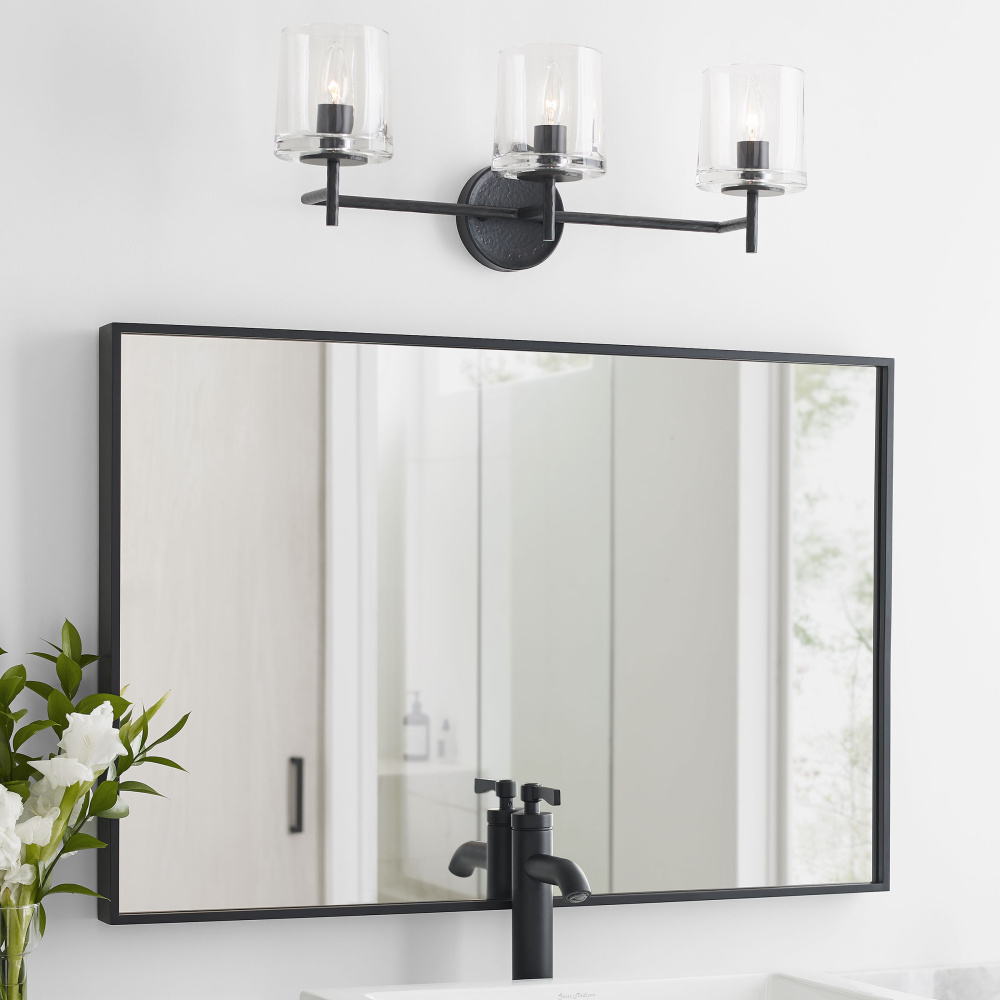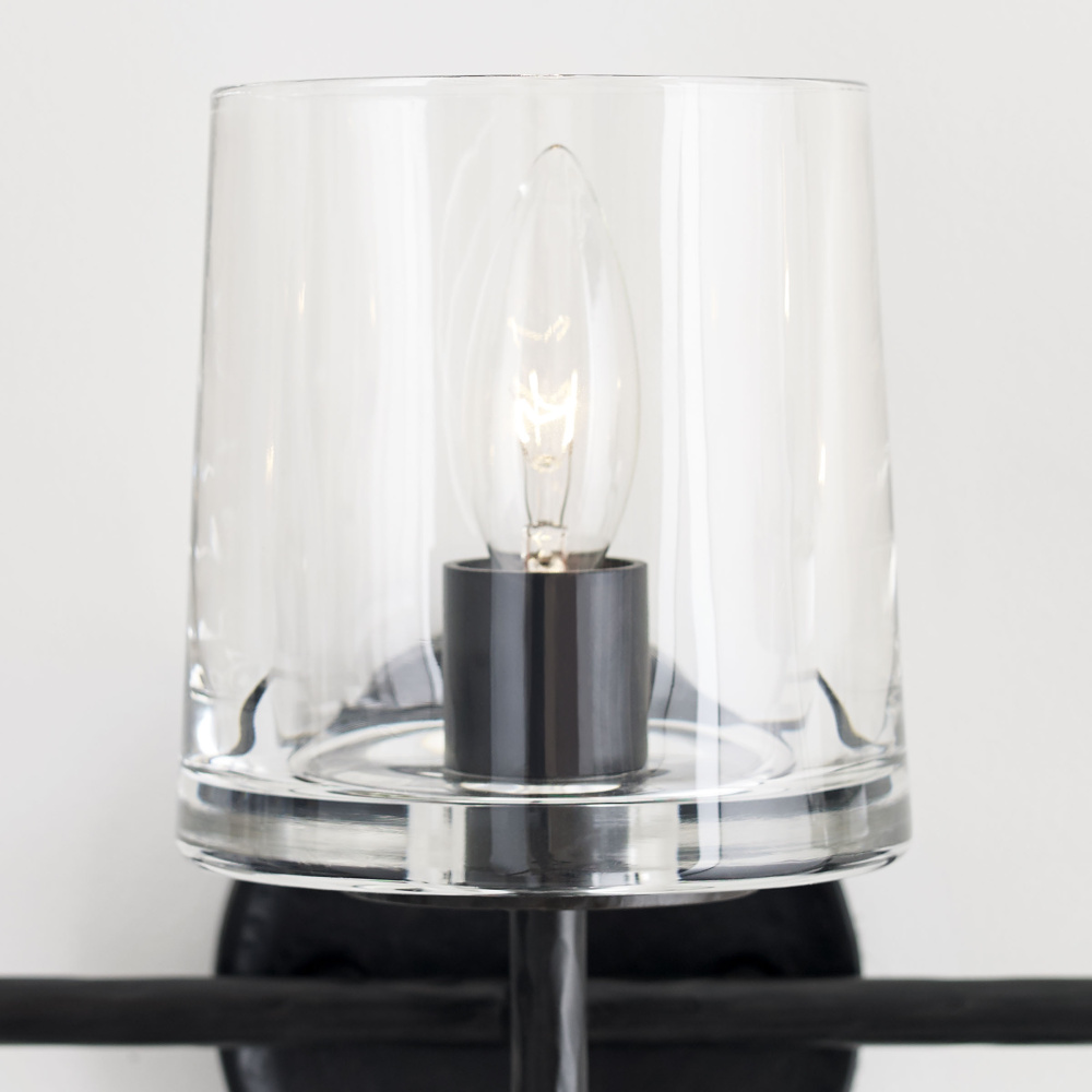 The Marietta three light vanity fixture in Aged Iron embodies Industrial charm with Midcentury flair, the Marietta vanity series features curved arms and mouth blown glass. This streamlined vanity series is crafted in an Aged Iron hammered iron finish that is simple yet timeless. Sophisticated and modern with an industrial edge, this sconce boasts a classic look that works well in any decor.