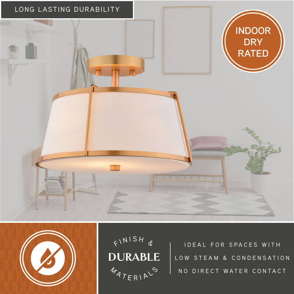 Instantly update your home's decor with the Marion 2-light semi-flush mount. The popular tapered white linen fabric shade design and mystic gold finish offer a modern take on mid-century style, making it a great fit for transitional interiors as well. Offering the perfect balance of style and functionality, the Marion light adds a sophisticated glow to your space. This easy-to-install ceiling fixture makes a big impact in smaller spaces like entryways or hallways, or as a statement piece in a bedroom.