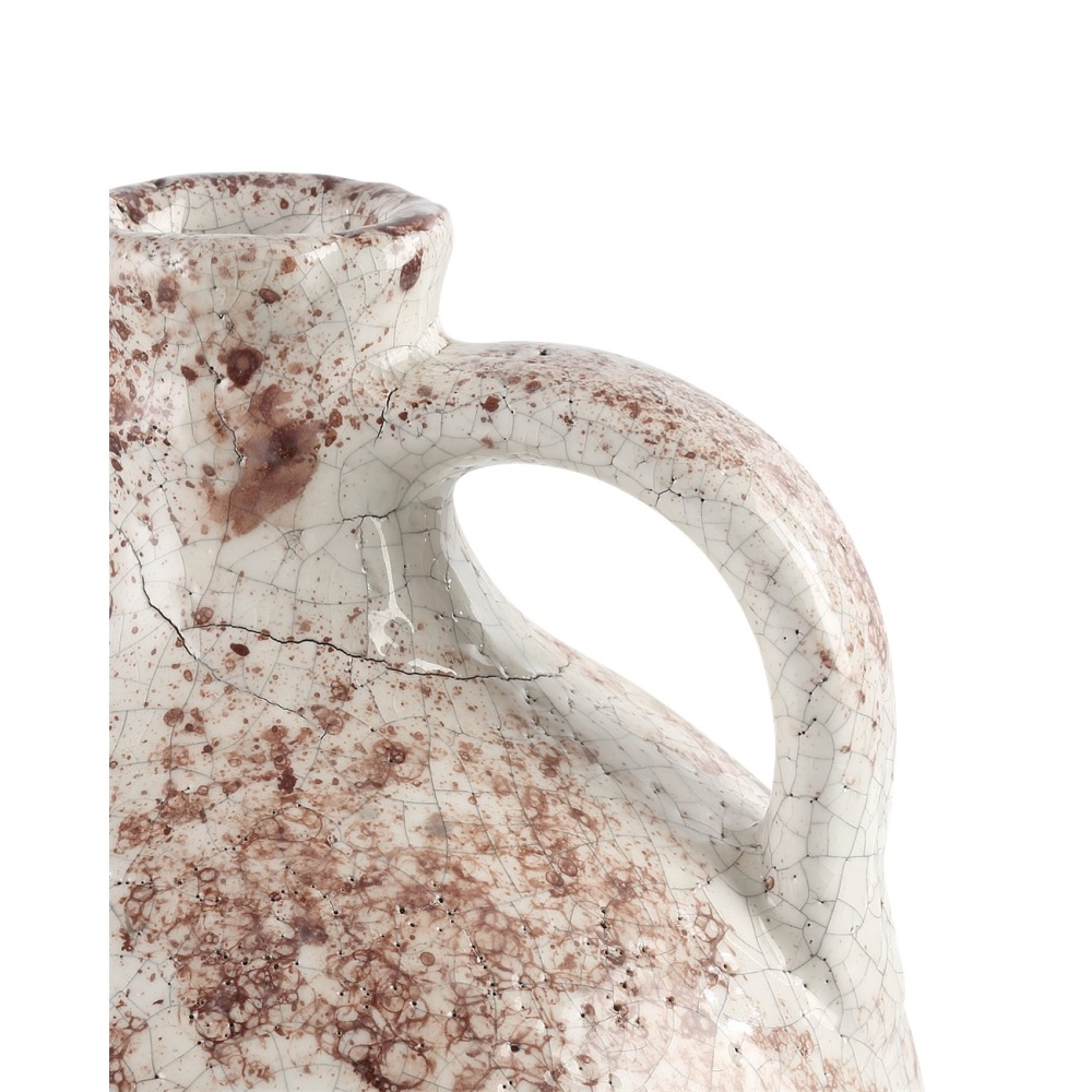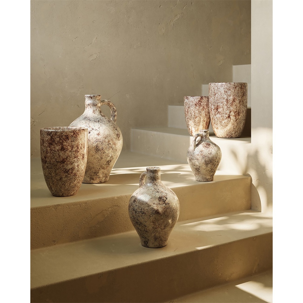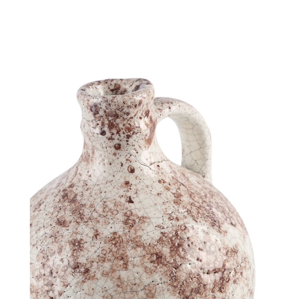 The Marne Demijohn Set is made of terracotta to reflect the rustic sophistication seen throughout southern Italy. The mottled surface of the jugs have been treated to pitting and other imperfections that create an aged effect. These white and brown vessels will bring the feel of an antique to a space and, because the finishes are hand-applied, each surface will vary slightly.