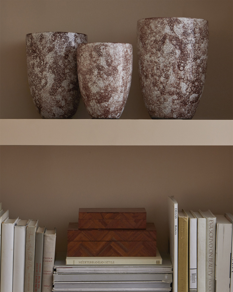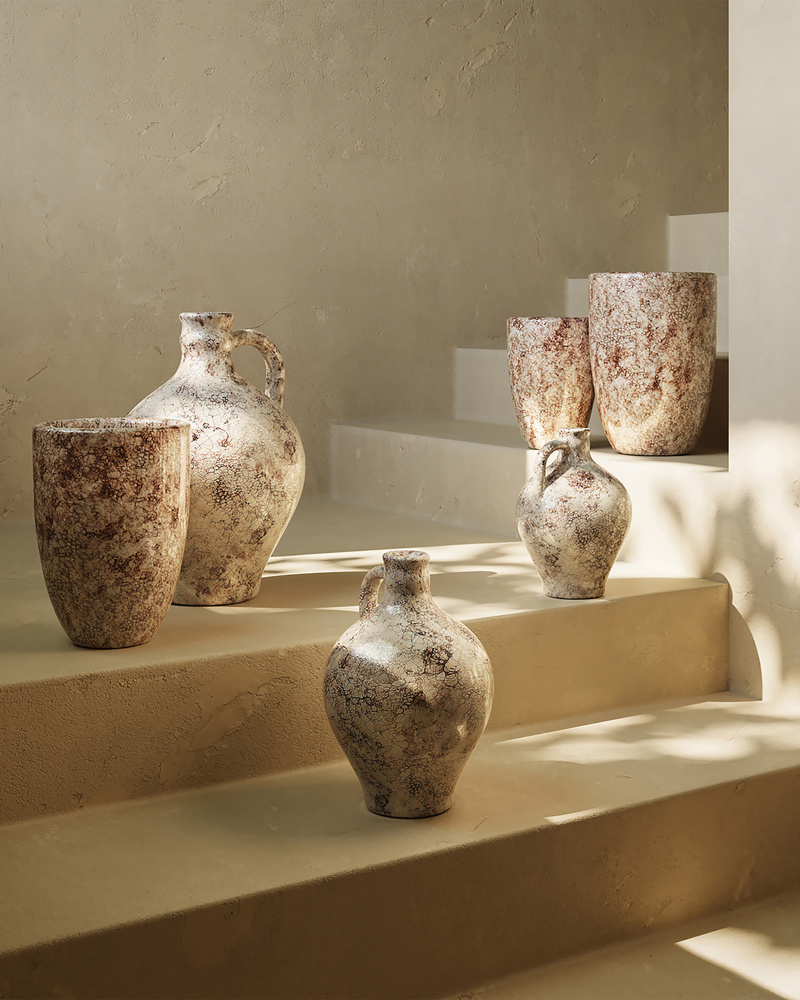 The Marne Vase Set is made of terracotta to reflect the rustic sophistication seen throughout southern Italy. The mottled surface of the vases have been treated to pitting and other imperfections that create the ruse they are aged. These white and brown vessels will bring the feel of an antique to a space and, because the finishes are hand-applied, each surface will vary slightly.
