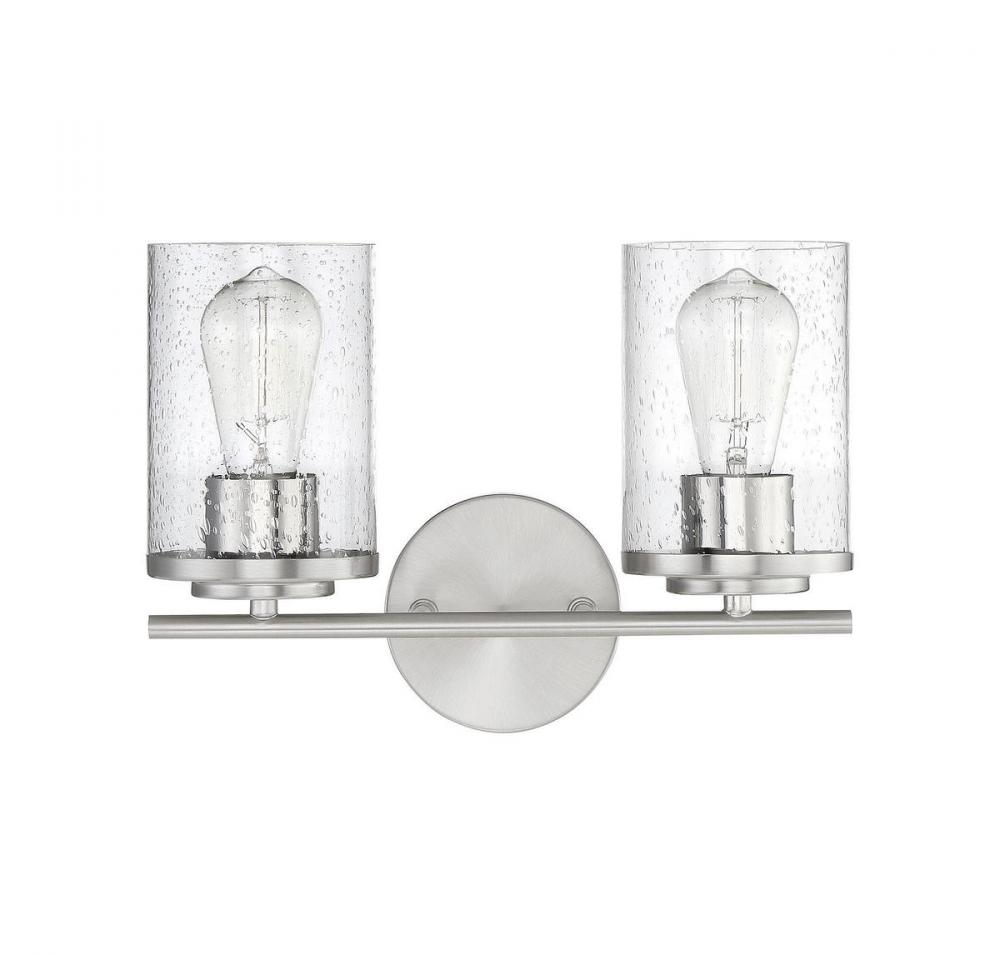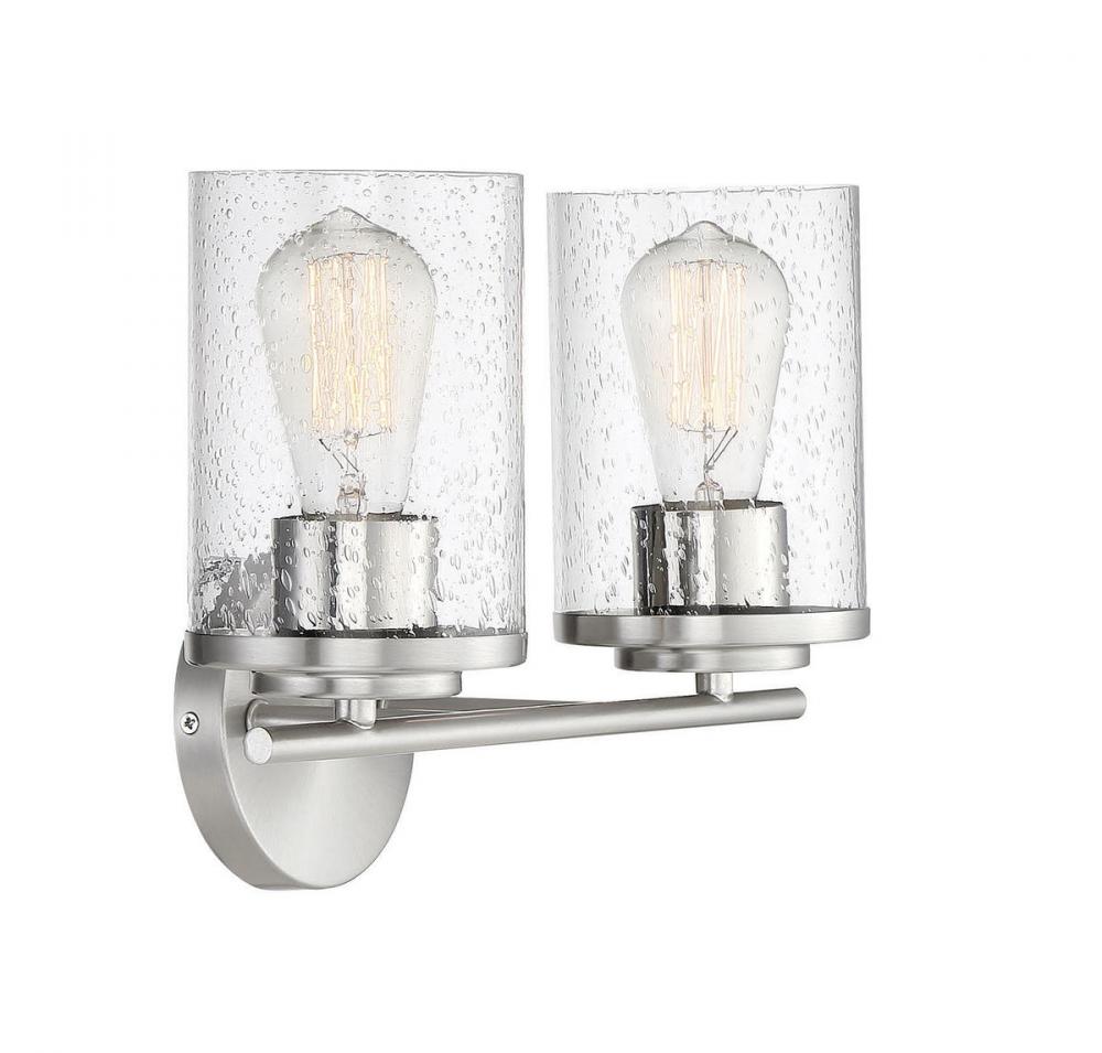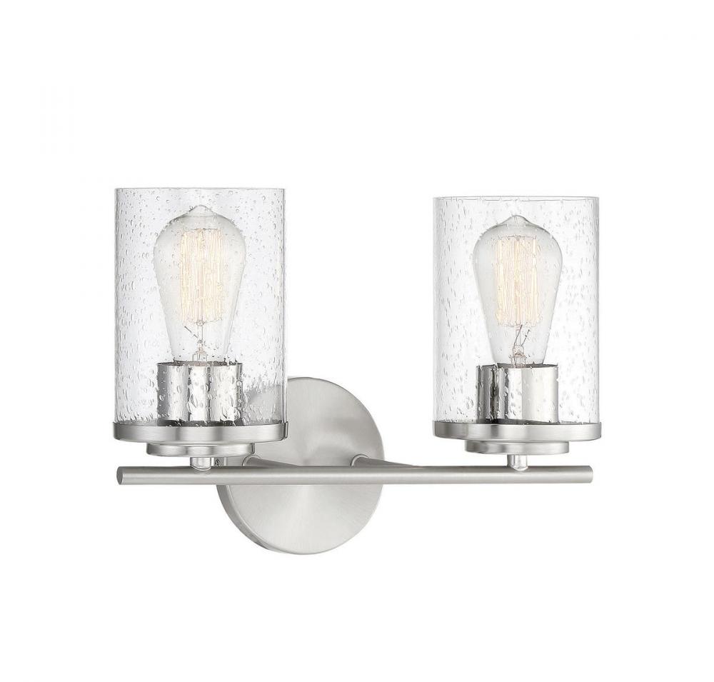 Illuminate your vanity mirror beautifully with this Savoy House Marshall 2-light bath bar. Its classic Americana look fits in perfectly with a wide varietyof decor styles. The hurricane-style shades of clear seeded glass add a boost of drama and intrigue and the circular backplate brings in another dimension of thoughtful detailing. Finished in Polished Chrome. This fixture is 13.25" wide and 9.5" tall. It extends 6.5" from the wall. Uses 2 standard size bulbs of up to 60 watts each (not included).