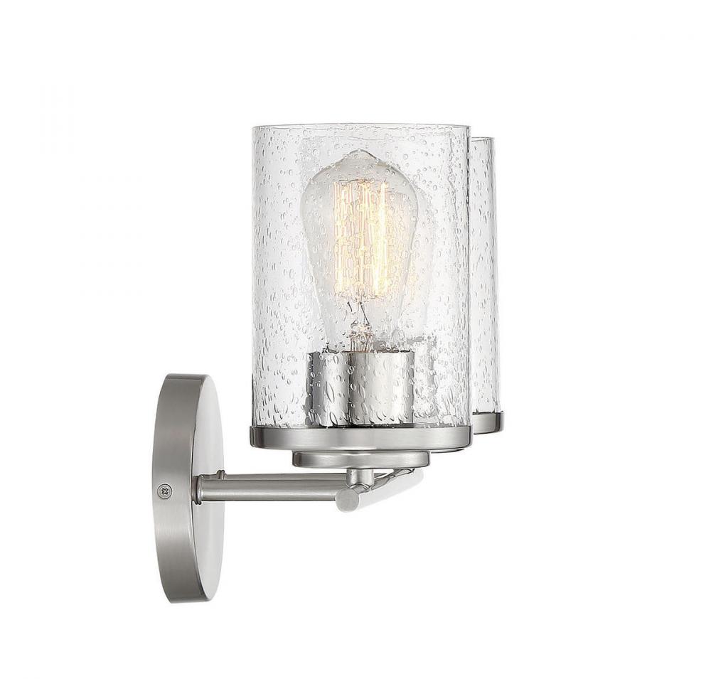 Illuminate your vanity mirror beautifully with this Savoy House Marshall 2-light bath bar. Its classic Americana look fits in perfectly with a wide variety of decor styles. The hurricane-style shades of clear seeded glass add a boost of drama and intrigue and the circular backplate brings in another dimension of thoughtful detailing. Finished in polished chrome. This fixture is 13.25" wide and 9.5" tall. It extends 6.5" from the wall. Uses 2 standard size bulbs of up to 60 watts each (not included).