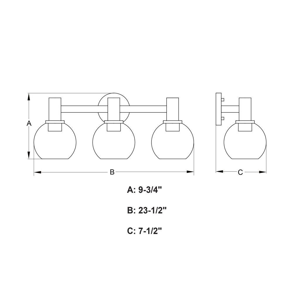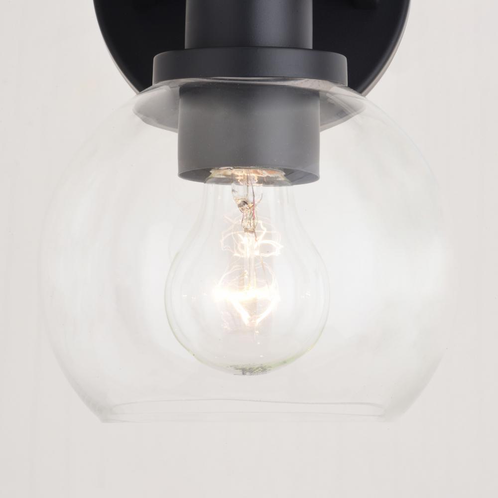 The Marshall collection is transitional style with a contemporary flair at a competitive price. Stately arms finished in matte black support clear glass globes for the perfect balance of dark versus light. with vintage style filament bulbs to complete the look, this bathroom light is ideal over medium vanities or as a pair over double sinks.