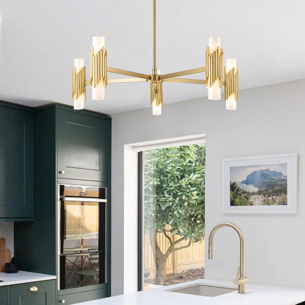 The Marvel 5 Light Chandelier is an adjustable height fixture finished in Aged Brass with each arm is accented by two pieces of Cased Opal Glass.