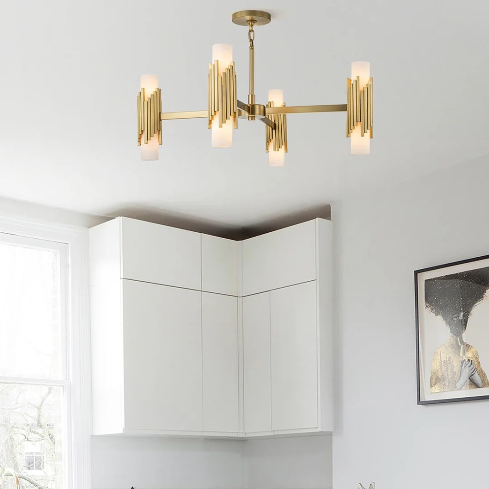 The Marvel 4 Light Chandelier is an adjustable height fixture finished in Aged Brass with each arm is accented by two pieces of Cased Opal Glass.