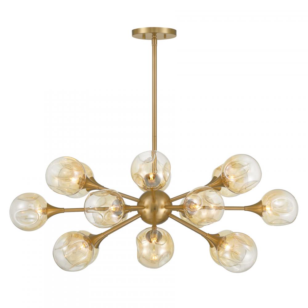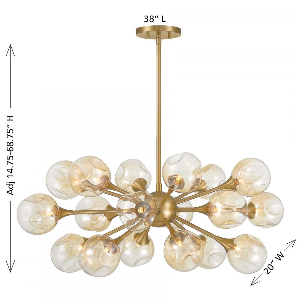Heighten the drama of any room with the boldly beautiful Savoy House Matisse 18-light pendant. Its Sputnik style structure is studded with eye-catching dimpled shades of gold asymmetric plated glass and finished in Warm Brass to create a spectacular look. Matisse is 38" in length, 20.5" in width and has an adjustable height ranging from 14.75" to 68.75". Uses eighteen G9 bulbs, which are not included. Comes with four 12" downrods and one 6" downrod.