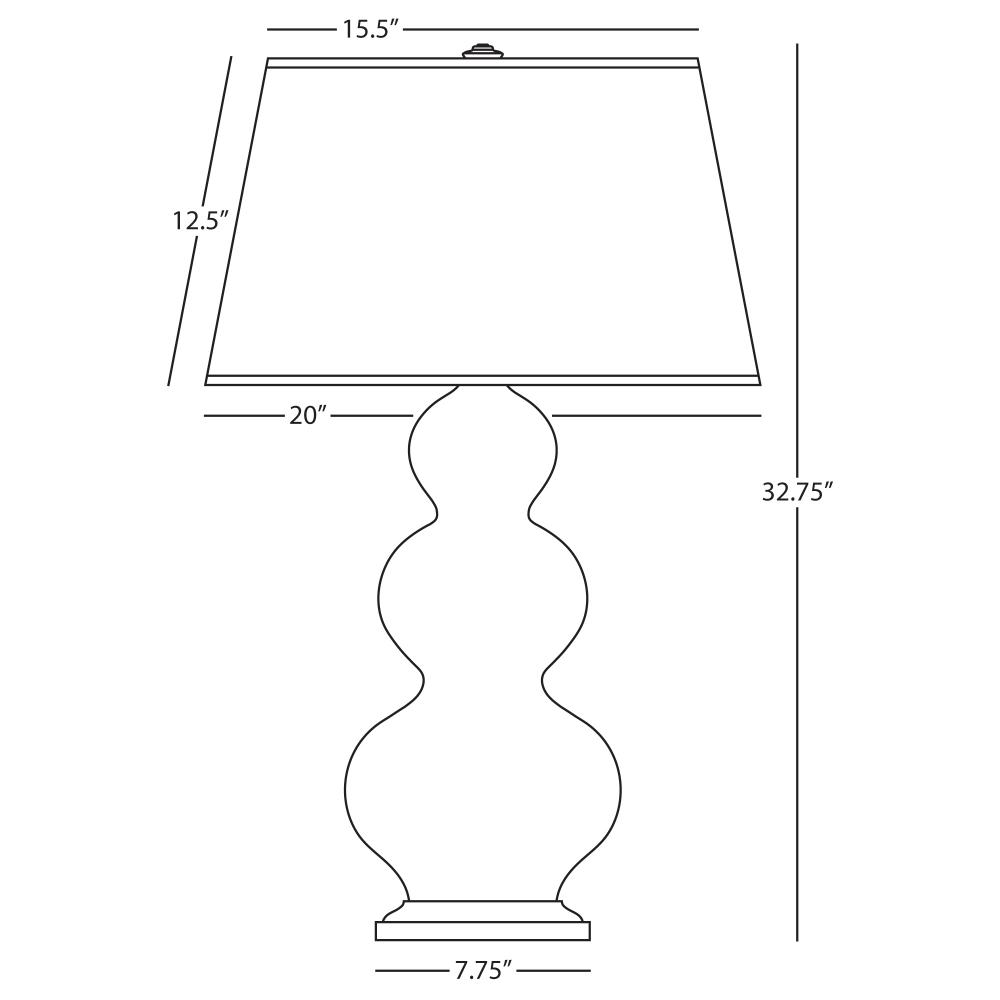Our Triple Gourd collection features a simple but gracefully curving silhouette. Available in a wide array of vibrant colors and several different base finishes. -Midnight Blue Glazed Ceramic with Antique Brass Finished Accents Triple Gourd Table Lamp with Pearl Dupioni Fabric Shade