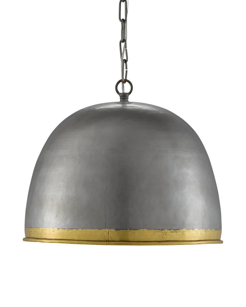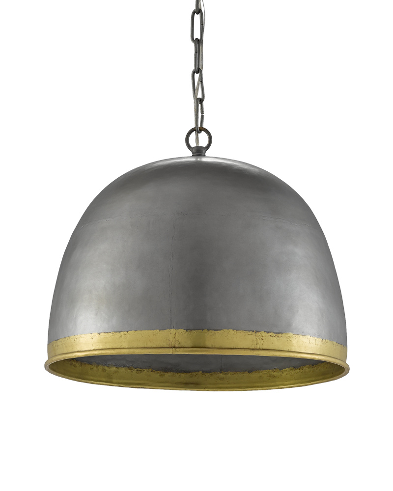 Leading the charge among our industrial chic offerings is our Matute Pendant, an edgy composition with a surprising mix of finishes. The dome-shaped shade is made of iron in a pewter finish. We dressed it up just a bit by adding a ring in a brass finish around the bottom edge. The interior of the shade has been treated to a polished brass finish to bring warmth to the illumination wafting from within the bold fixture.