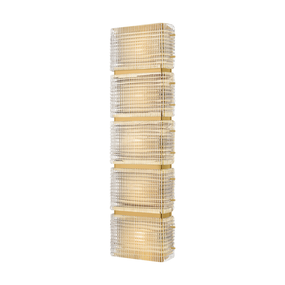 Taking inspiration from retro glass blocks, the Mav sconce puts a contemporary spin on a playful motif. with a shallow profile, the vertically stacked square design is marked by intricate cut crystal details. The highly textured clear piastre glass beautifully reflects and refracts light, creating a striking visual effect when lit. Mav is available with 3 or 5 lights to make a statement in modern interiors.