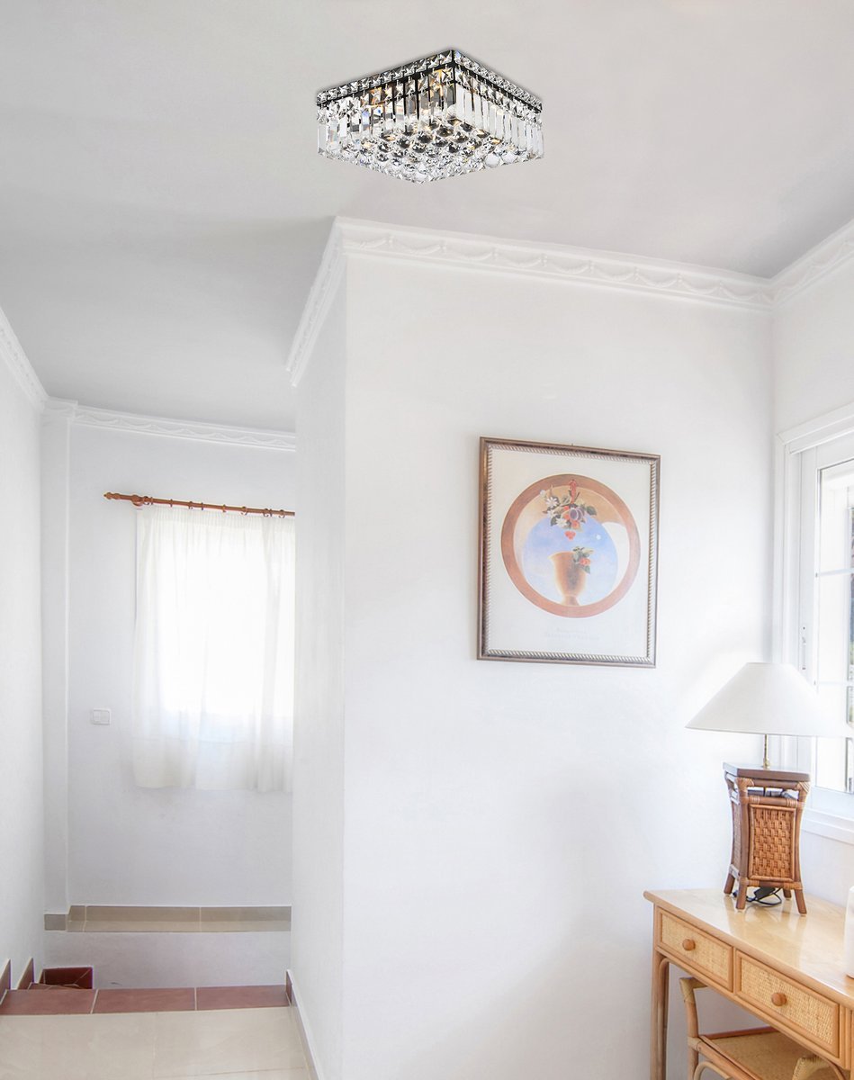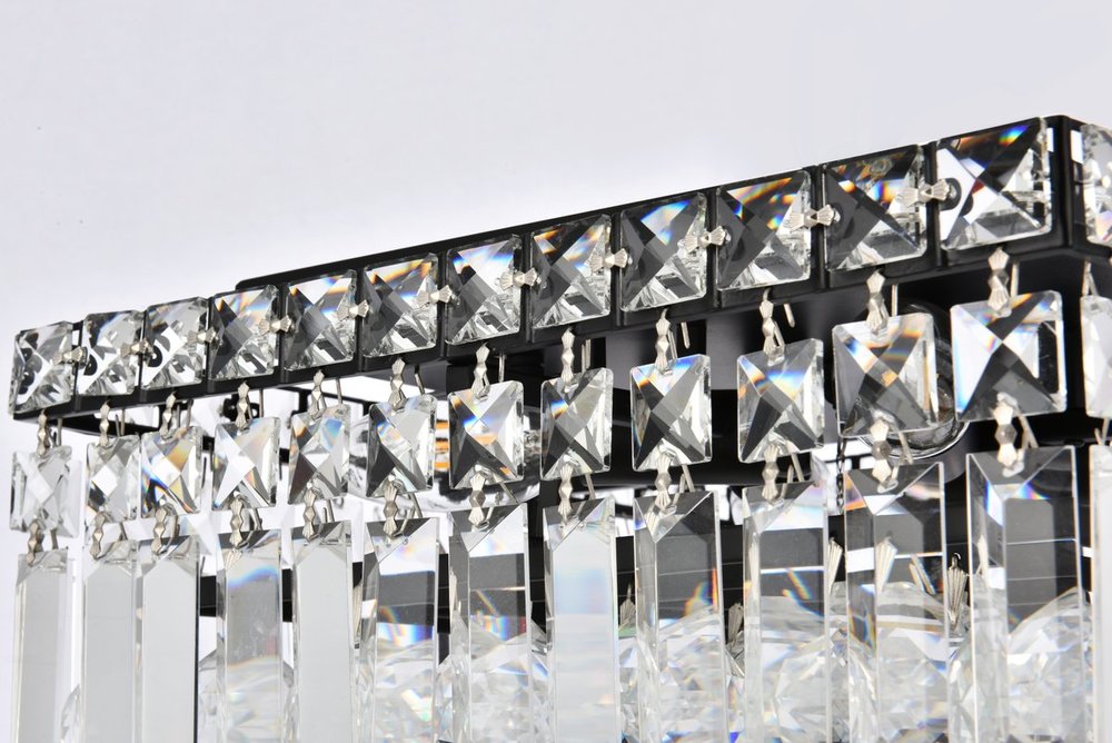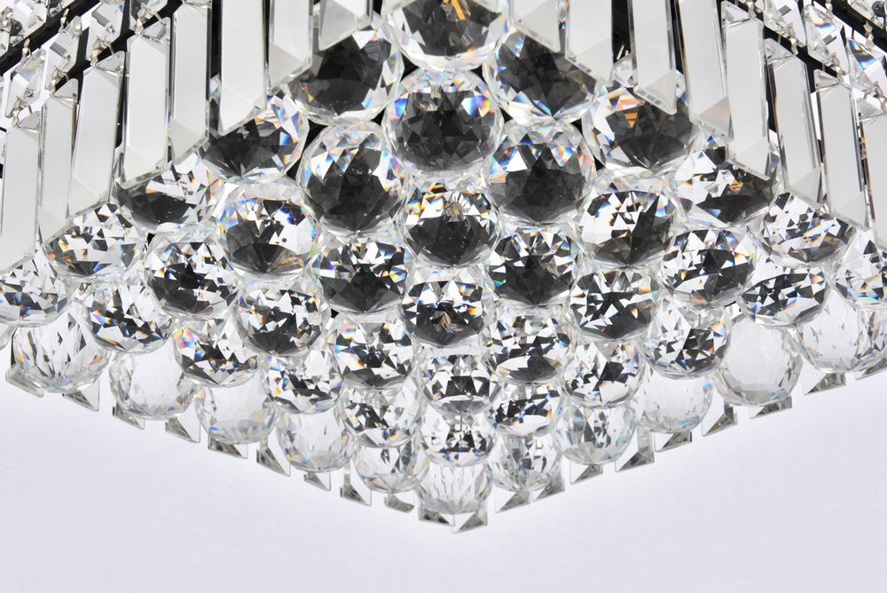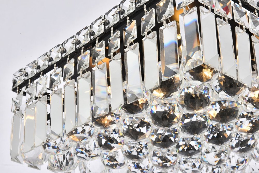 A riot of shapes and textures, Maxime collection flush mounts sparkle in a mosaic of crystal tiles. Square and rectangular precision-cut crystals form the flamboyant exterior while faceted crystal balls create a bubbled effect for light to shine through beneath. Available in a black or chrome finish with clear crystals, these lamps are a luxurious addition to a kitchen, stairwell, foyer, or living room.
