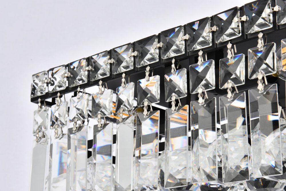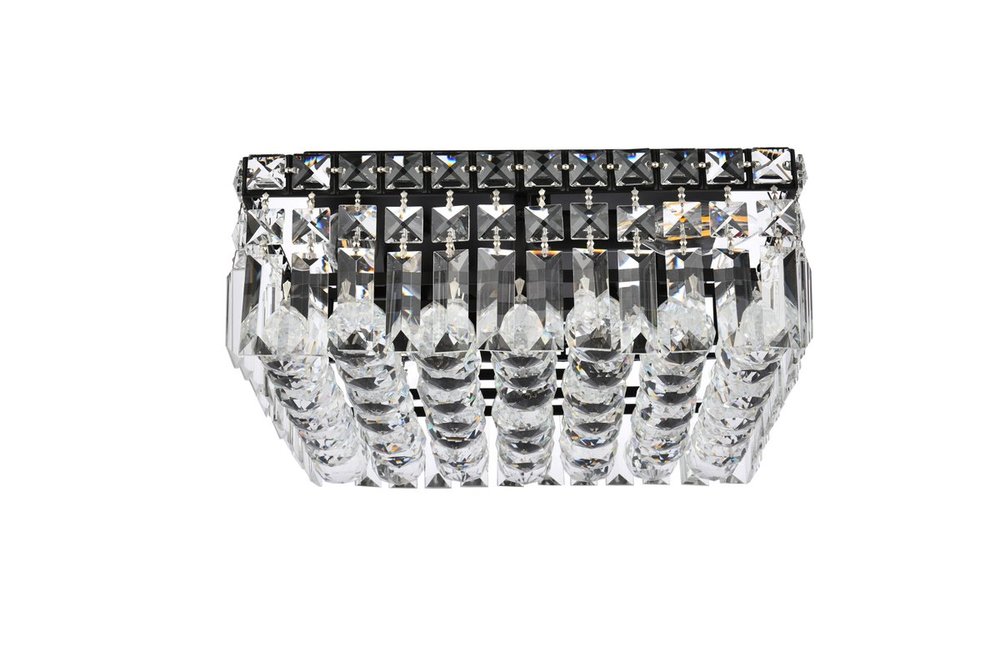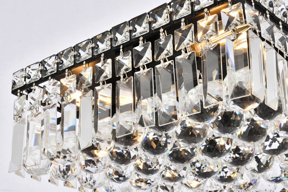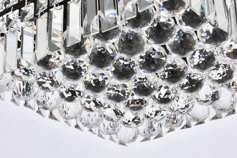A riot of shapes and textures, Maxime collection flush mounts sparkle in a mosaic of crystal tiles. Square and rectangular precision-cut crystals form the flamboyant exterior while faceted crystal balls create a bubbled effect for light to shine through beneath. Available in a black or chrome finish with clear crystals, these lamps are a luxurious addition to a kitchen, stairwell, foyer, or living room.